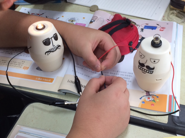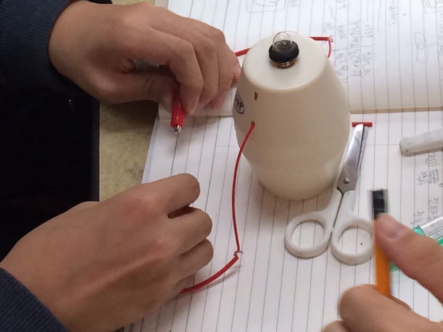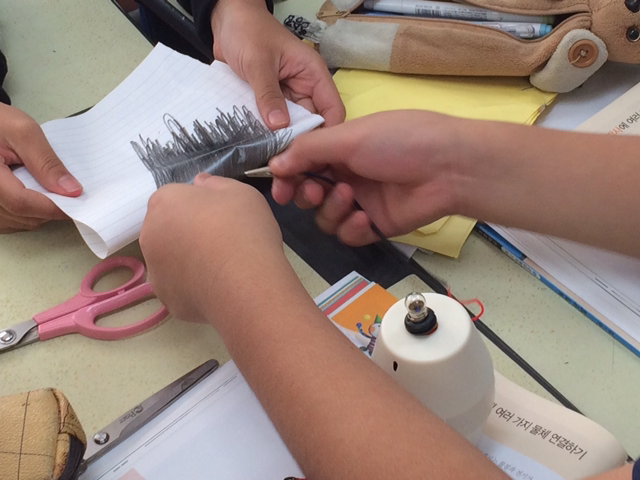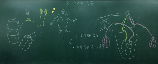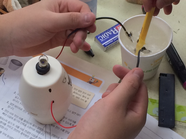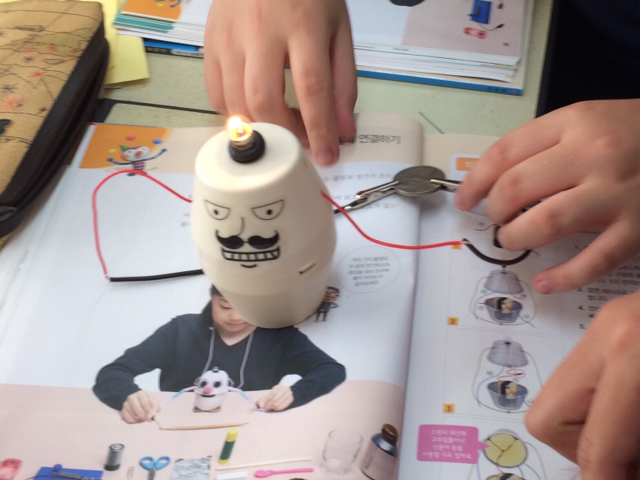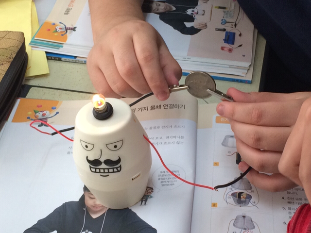 - 수업에 사용할 전선, 전지, 전구, 따로 준비한 모터 등이 잔뜩 담긴 바구니를 쉬는 시간.. 내 책상 위에 올려둔다. 아이들은 책상 주변으로 다가와 관심을 표한다.