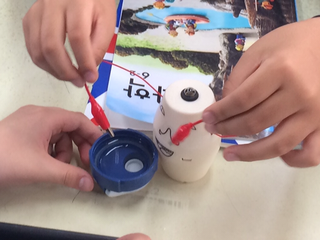 - 전기박사님을 소개합니다. (미리 만들어둔 전기박사를 보여주며) 바로 이분인데요, 이분은 이렇게 집게로 된 팔이 두 개가 있습니다. 이 팔로 물건을 잡을 수 있어요. 이렇게 클립을 잡으면.. (클립의 양쪽에 집게를 물린다.) 이렇게..