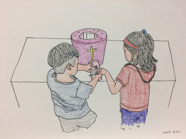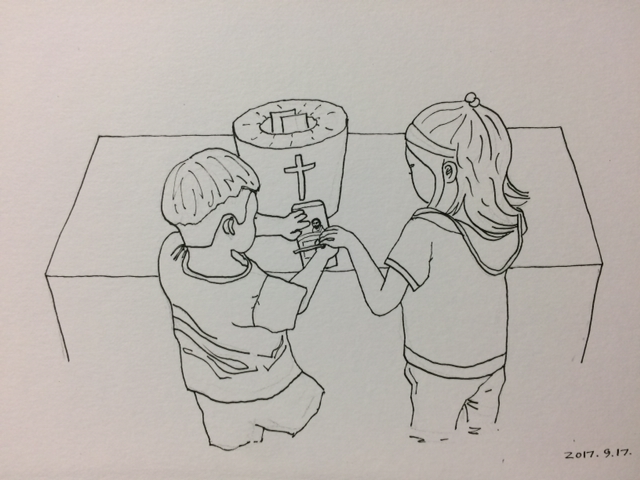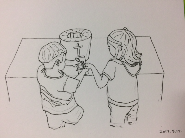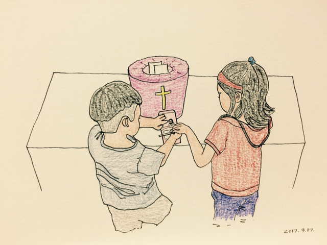유치부 예배를 위해 교회에 도착한 윤이와 온이는 헌금을 하기 위해 봉투에 이름을 씁니다.