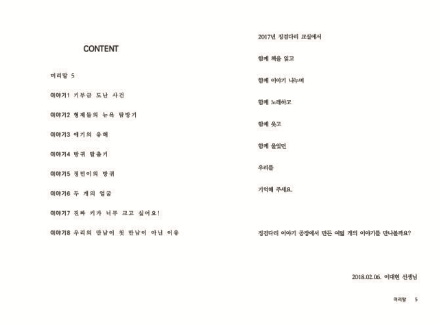 이 책의 주인인 아이들에게 해주고 싶은 말이다. 아이들이 가진 이 책은 2017년 징검다리 교실에서의 아이들의 모습을 담고 있다.
