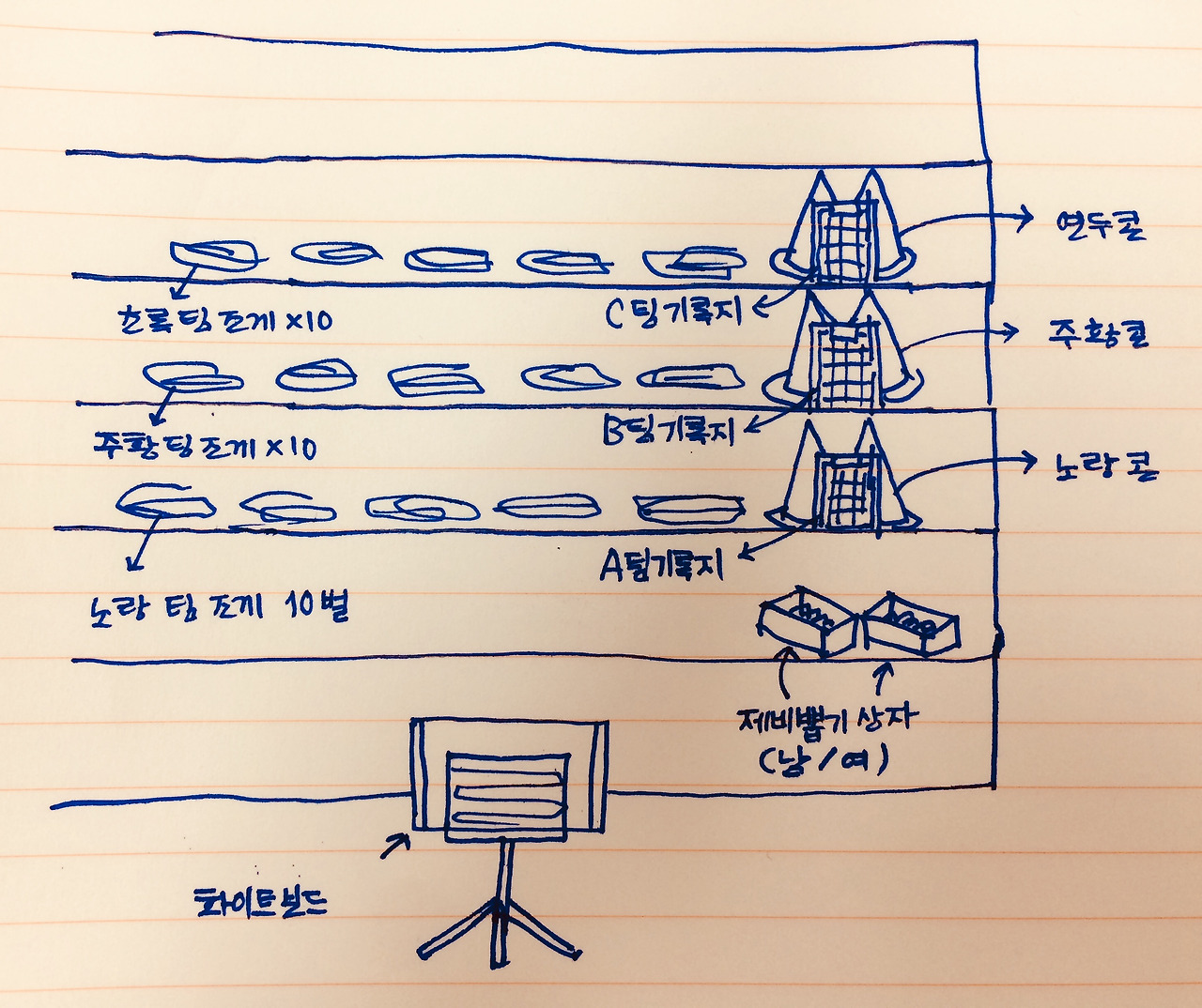 : 남학생 첫 줄은 연두색 콘에서 반반, 남학생 두 번째 줄은 파랑색 콘에서 반반, 여학생 첫 번째 줄은 주황생, 두 번째 줄은 노랑색
