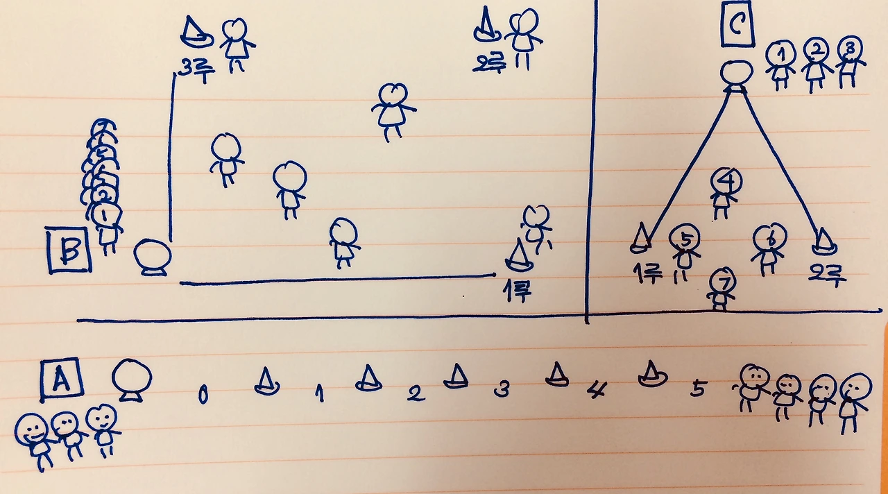 - 제비뽑기를 통해 팀을 세 개(A, B, C)로 나누기, 조끼 입어 팀 구분하기