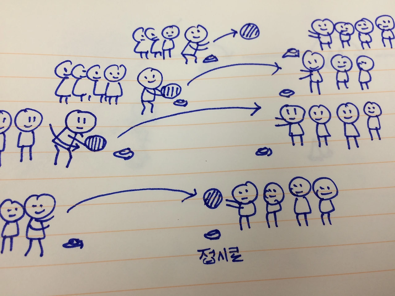 - 공 언더핸드로 던져주고 맞은 편 줄 제일 뒤로 뛰어가기 : 한 줄 나오게 해서 함께 하며 시범 보이기