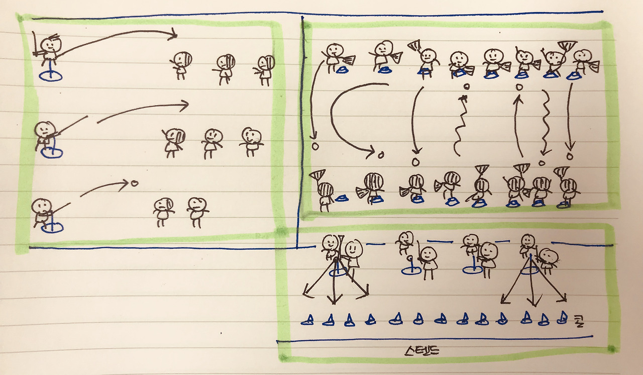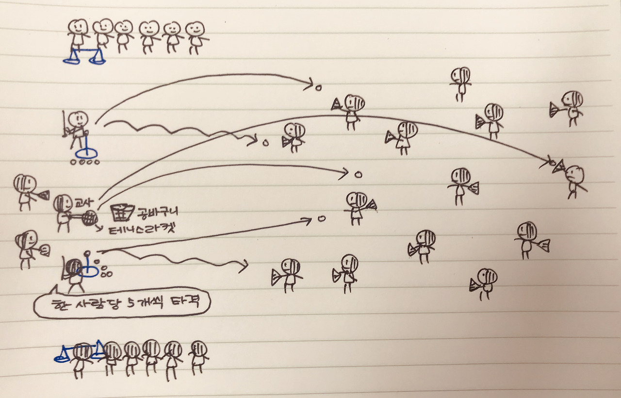 - (아이들은 상황에 따라 나름 전략을 팀끼리 공유하며 즐겁게 참여한다. 승부에 집착하여 감정을 드러내는 아이도 있다. 그럴 땐 전체에게 배우는 과정이라는 것을 강조하며 다독이고 가르친다.)
