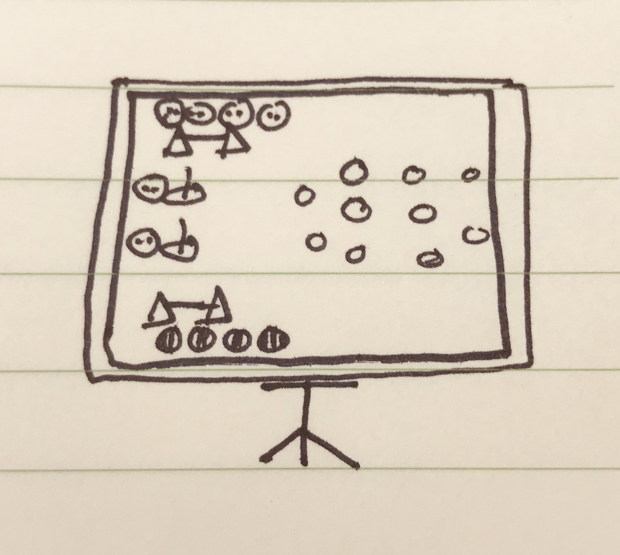 - 먼저 수비하는 팀은 여기 화이트보드에 모여서 위치를 정하고 이름을 적어놓고 수비위치로 이동합니다. 함께 의논해서 정해 보세요.