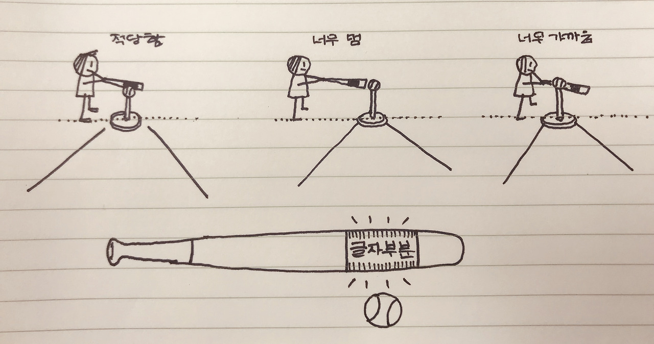 - 배트를 잡은 두 손을 앞으로 뻗었을 때 배트의 글자부분이 공을 칠 수 있도록 거리를 조정한다.