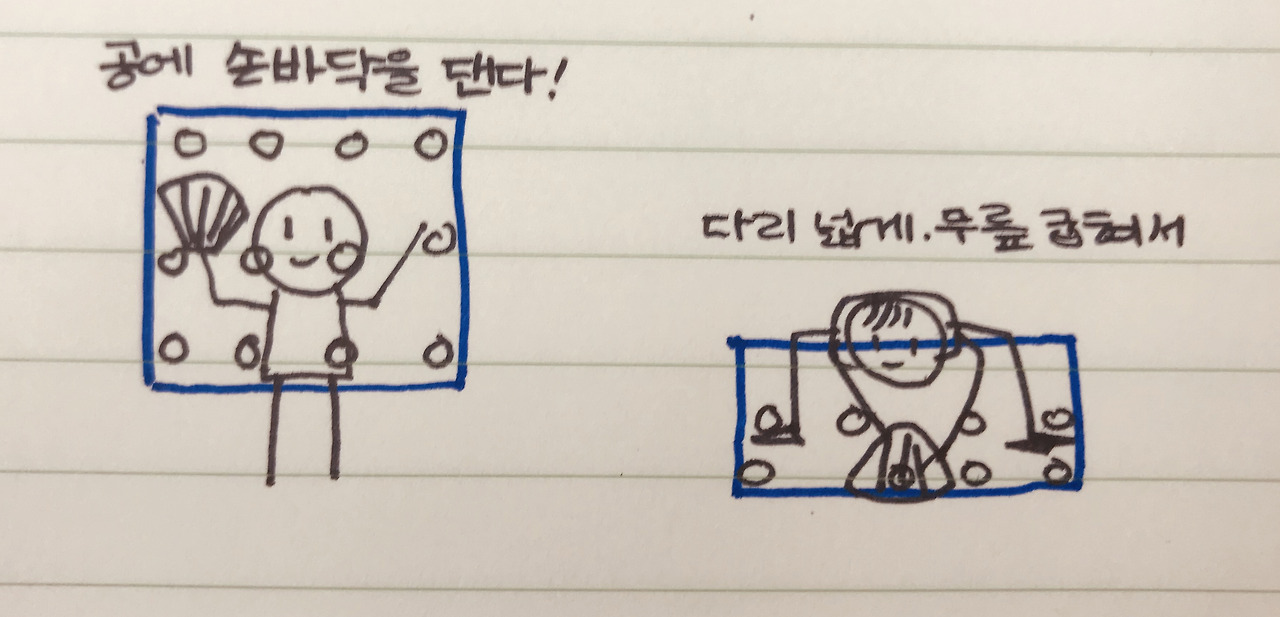- 운동장 1바퀴, 스트레칭(손목, 허리, 어깨 중심)
