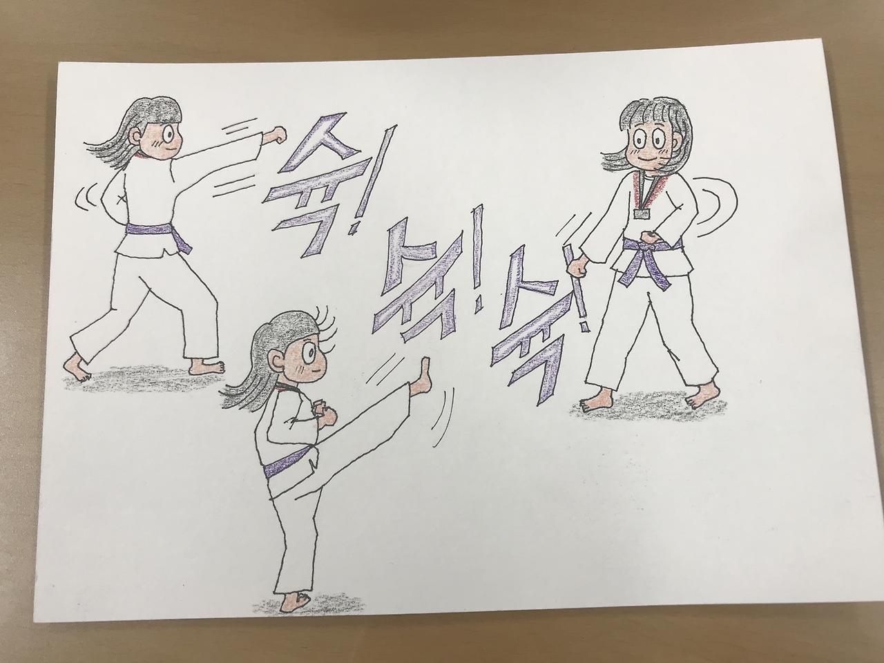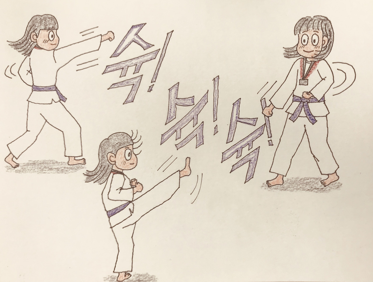 어느새 보라띠를 매고 힘차게 품새를 하는 윤이