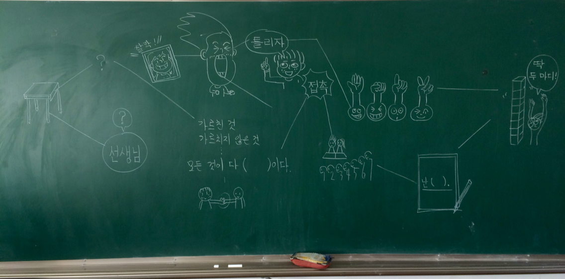 : 30개의 책상, 아이들은 28명. 모든 책상을 아주 깨끗하게 닦았지요. 딱 하나만 빼고요. 그 하나는 가운데 분단의 앞에서 두번째 자리입니다. 내일 아이들은 여기저기 친구들과 함께 자리를 잡겠지요. 다른 책상에 비해 지저분한 그 책상을 알아차리지 못할 수도 있지만, 그 자리가 아이들에게 더럽다는 이유로 소외받는다면 최고겠지요. 칠판에 그려둔 책상 이야기를 시작합니다.