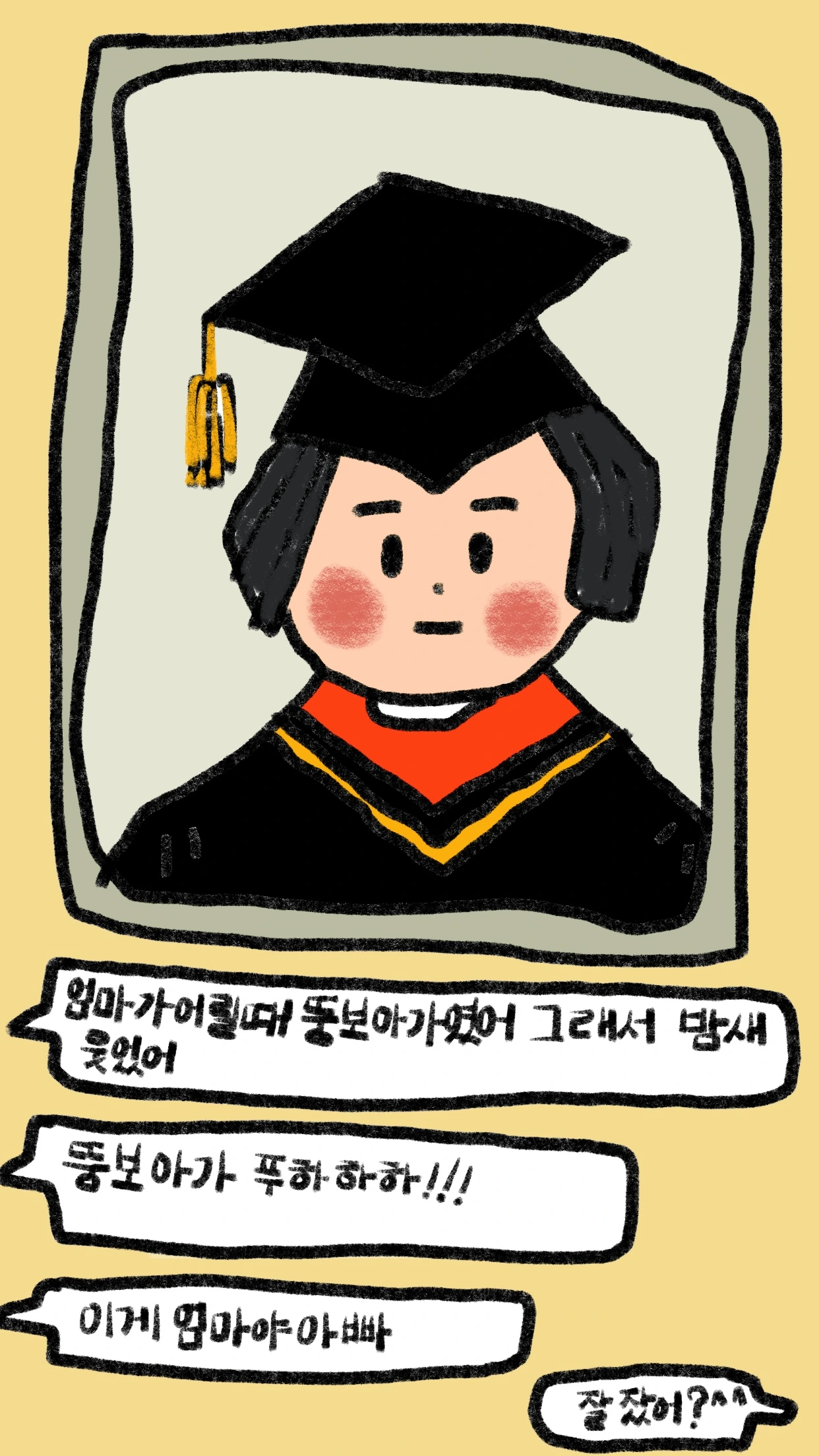 엄마의 유치원 졸업식 사진을 보고는 밤새 웃었단다.