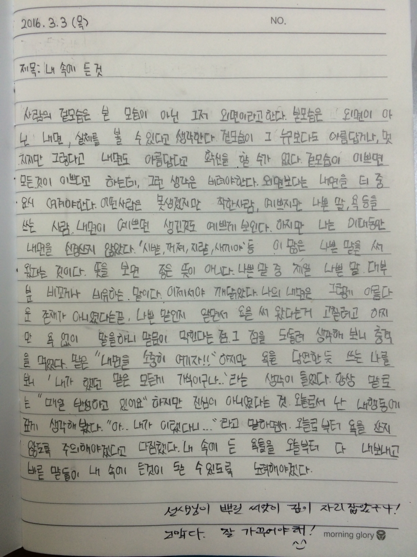 - "선생님이 여러분 속에 든 욕들을 다 써보라고 한 이유는 여러분이 장난처럼 쓰는 그 욕의 뜻을 알려주기 위해서였습니다."