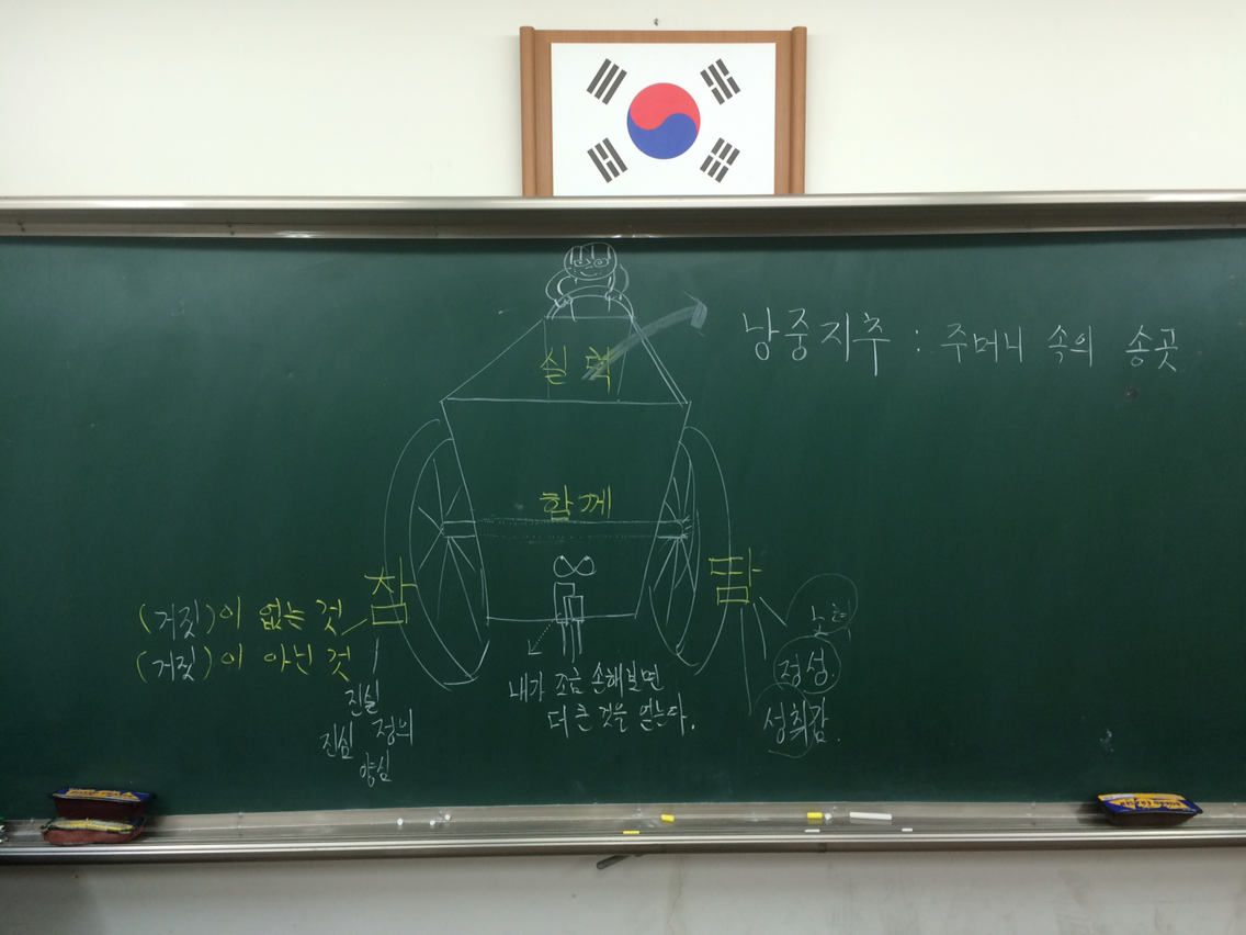 - 참: 거짓이 아닌 것, 거짓이 없는 것, 진실, 진심, 정의, 양심, 여기서와 저기서가 다르지 않는 것, 이 사람 앞에서와 저 사람 앞에서가 다르지 않는 것, 아는 것과 실천이 다르지 않는 것, '참'을 지키면 자유롭고 당당해 진다. 선생님은 참을 가르쳤으므로 여러분 앞에 부끄럽고 비겁해지지 않기 위해 여러분에게 '좋은 모델'이 되도록 노력할 거다. 그리고 여러분을 대할 때 짐심으로 대할거다. 거짓말하지 않을거다. 여러분이 거짓말을 해도 그대로 믿어줄 거다.