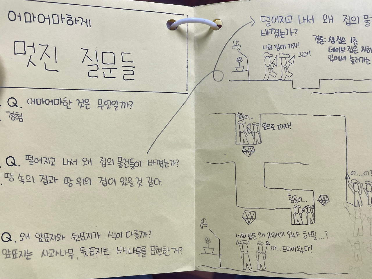: 선생님과 함께 책도 만들고 첫 번째 활동인 어마어마하게 멋진 추리게임을 했다. 그전 샘과 데이브를 선생님께서 읽어주셨는데 관련이 있는 거 같다. 그 책에 바로 밑에 보석이 있는(?) 그런 장면이 나왔는데 우리가 우리도 정답과 가까워질 때가 있었는데 그런 시련(?)이 와도 포기하지 않는 것을 가르쳐 주려고 하셨던 것 같다.