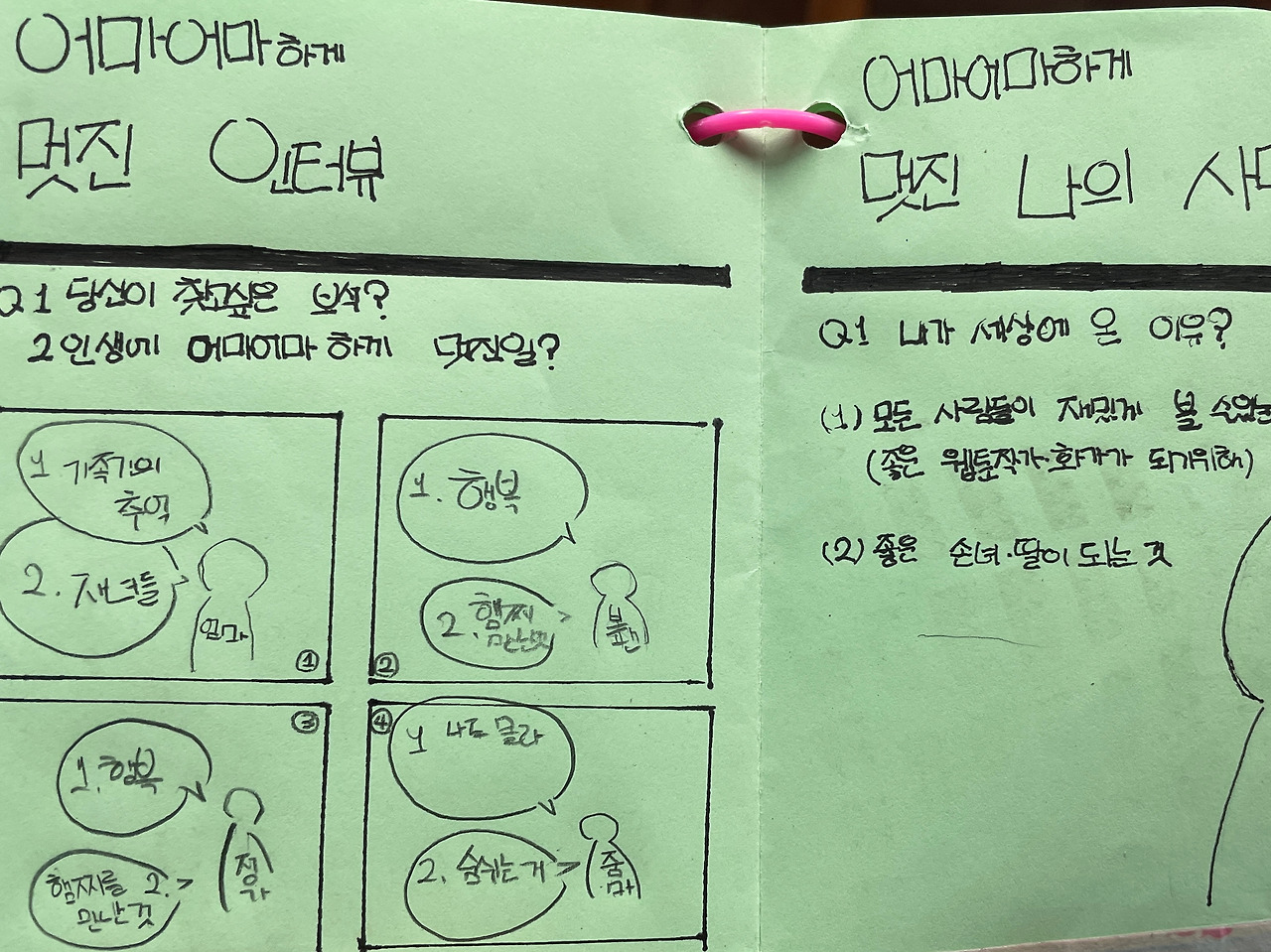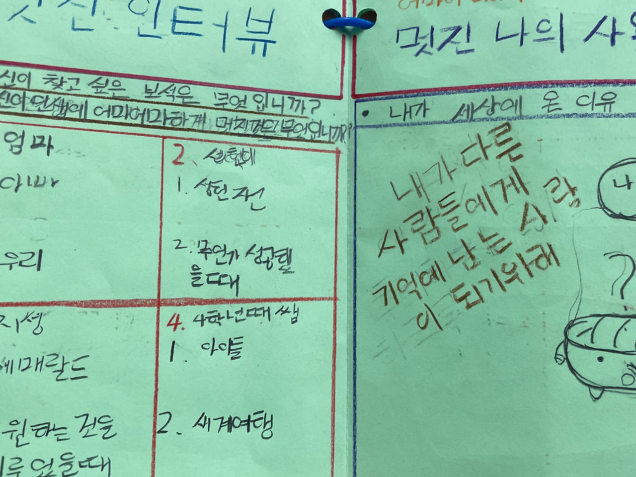 : (아이들의 활동지에는 인터뷰를 하고 들은 대답들이 기록으로 남겨져 있다. 학원 선생님은 여자 친구를 만난 일이 어마어마하게 멋진 일이라고 했고, 아빠는 엄마와 만나 결혼한 일을, 어떤 친구는 내가 원하는 직업을 가지는 일 등 아이들의 관점을 넓혀줄 수 있는 귀한 대답들이 참 많았다.)