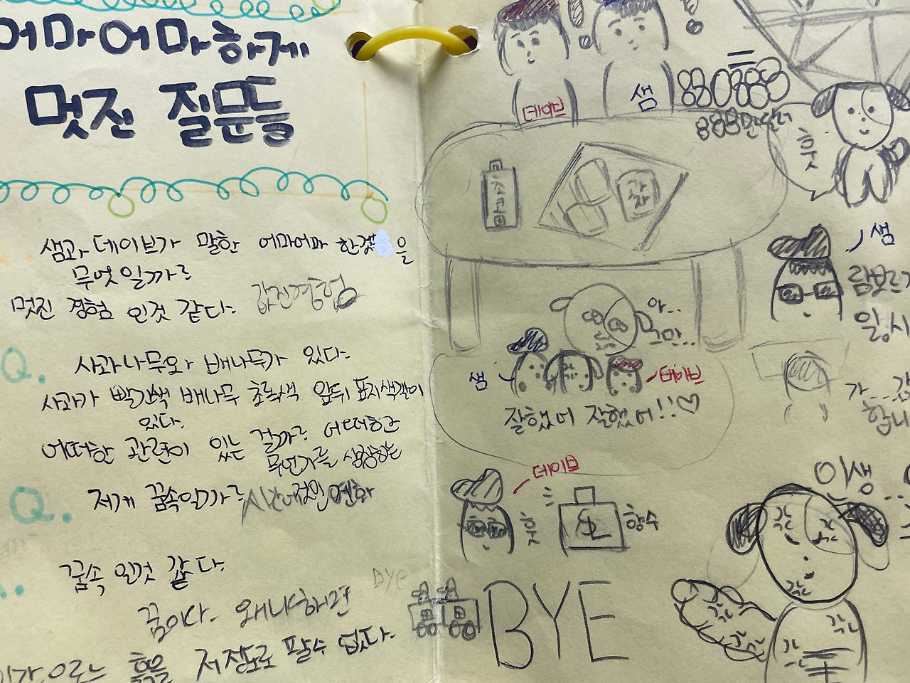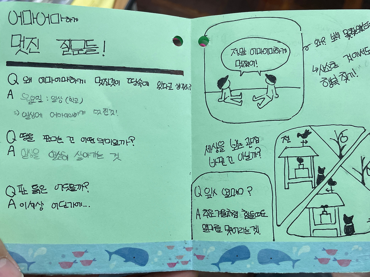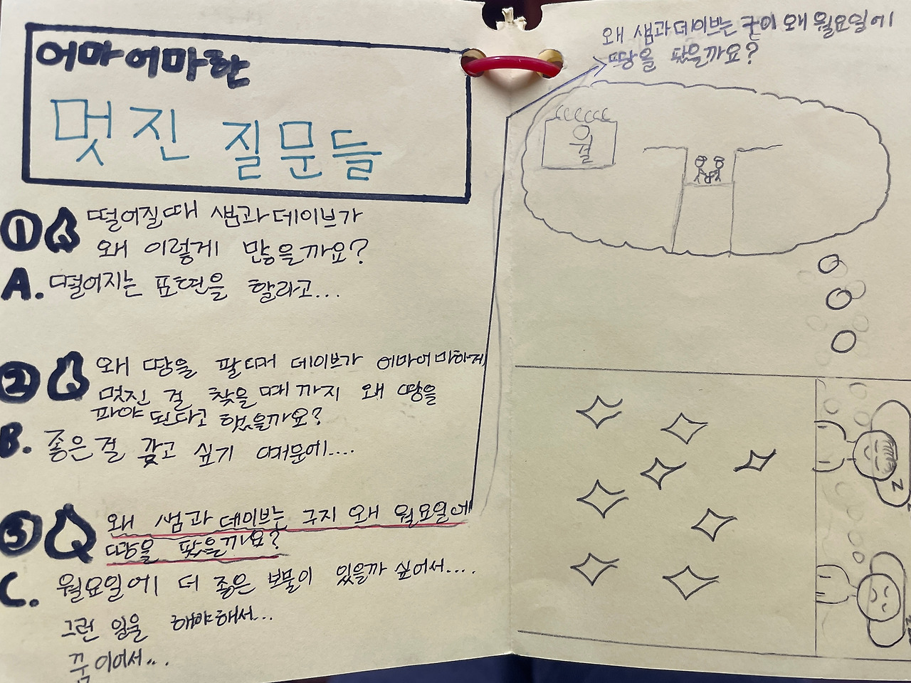 : (아이들이 각자의 질문에 대해 자신의 생각을 표현하는 동안, 나는 아까 나누었던 아이들과의 대화를 소개한다.)