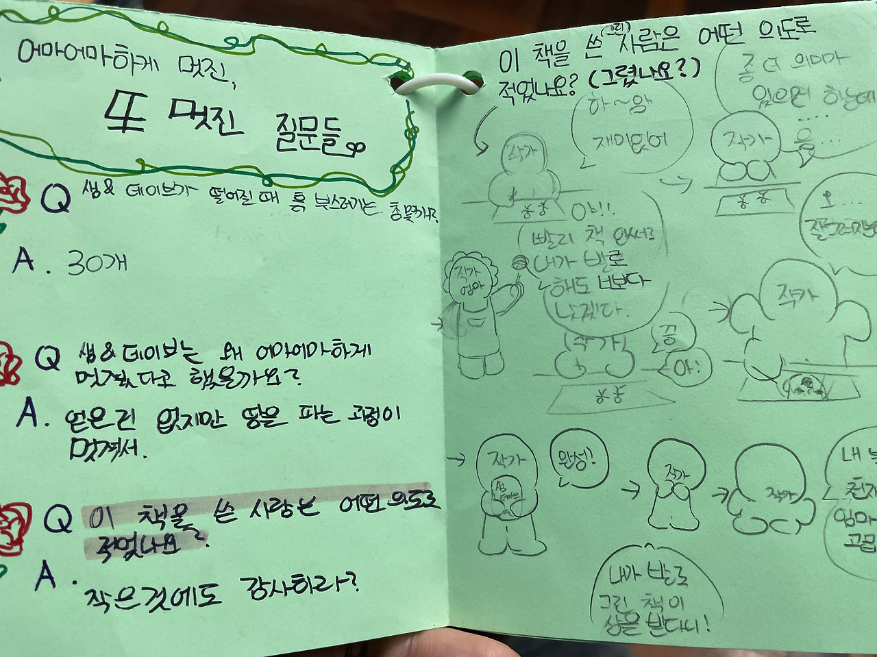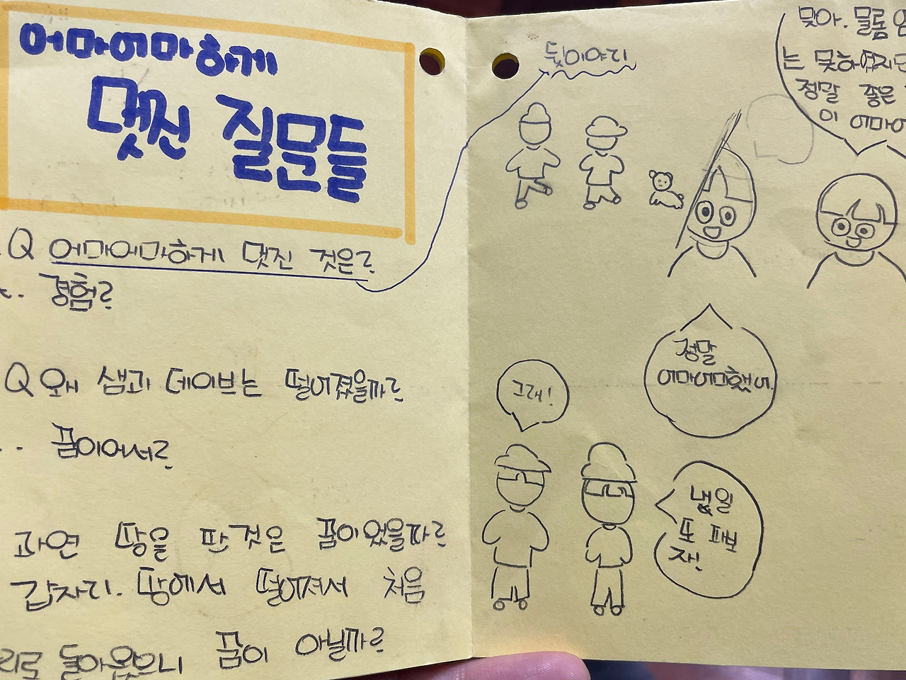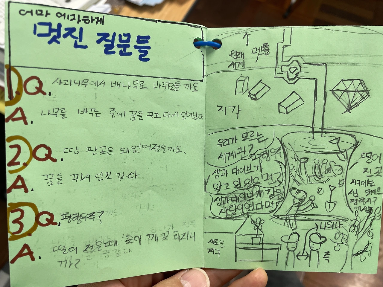 : (아이들이 각자의 질문에 대해 자신의 생각을 표현하는 동안, 나는 아까 나누었던 아이들과의 대화를 소개한다.)