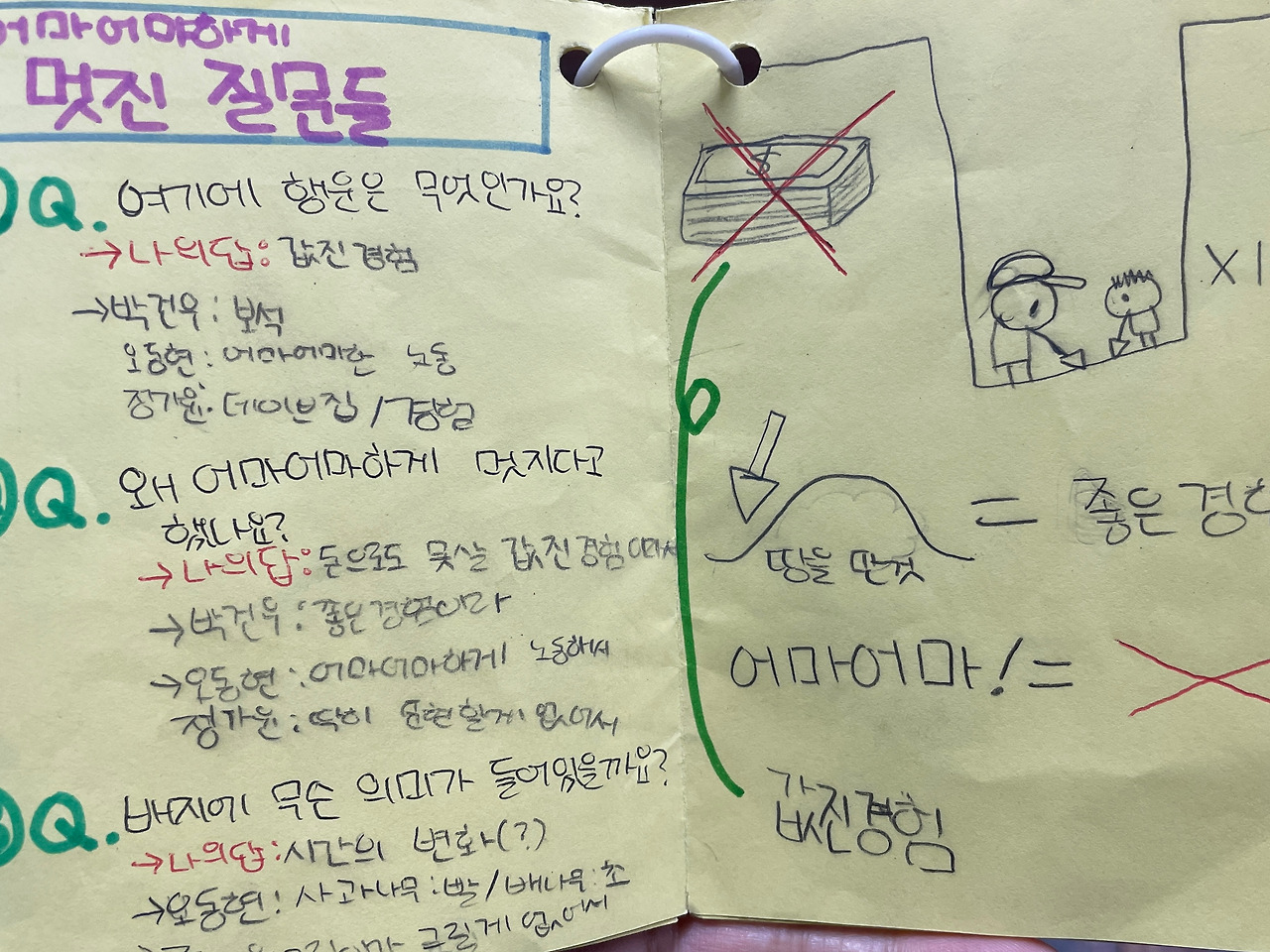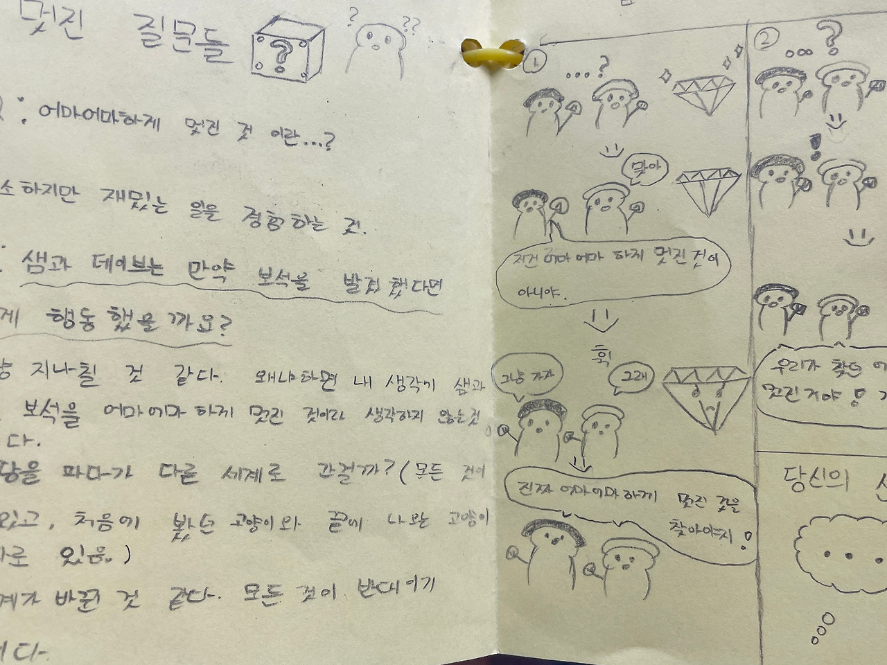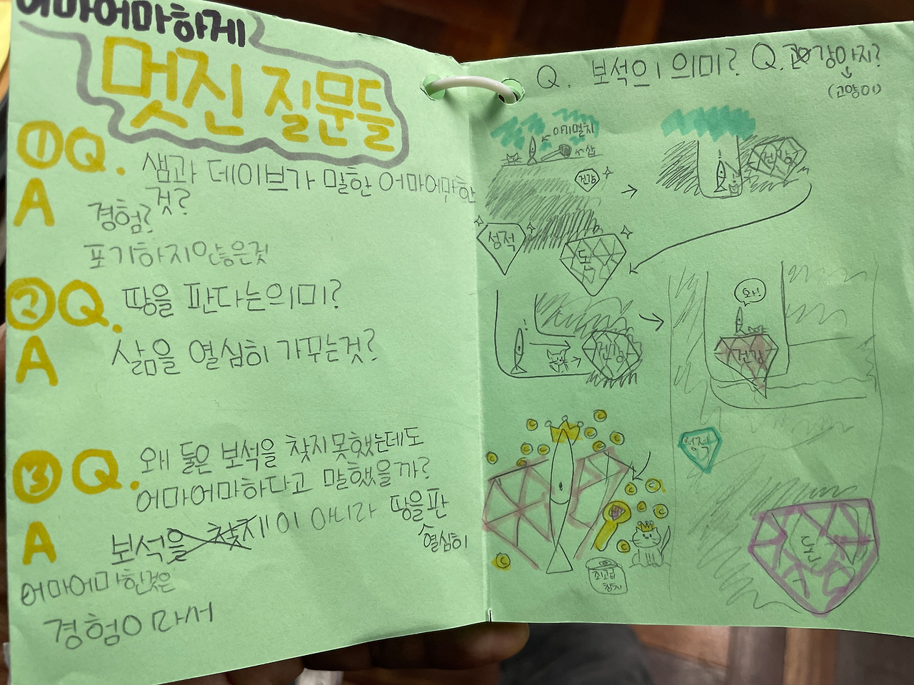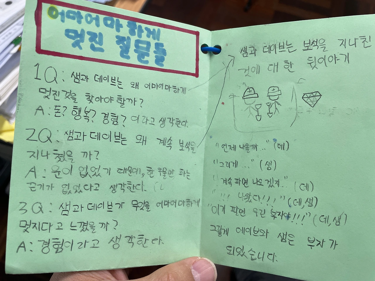 : 보석을 결국 발견하지 못했는데, 그럼 샘과 데이브는 헛된 일을 한 것일까? 하는 질문도 있었어. 둘의 땅 파는 일은 헛된 일이었을까? 보석을 발견하지 못했기 때문에 헛된 일이었다는 답을 하는 친구도 있었고, 땅을 파는 일 그 자체가 어마어마하게 멋졌다고 이야기했으니까 그것으로 충분하다는 답도 있었어.