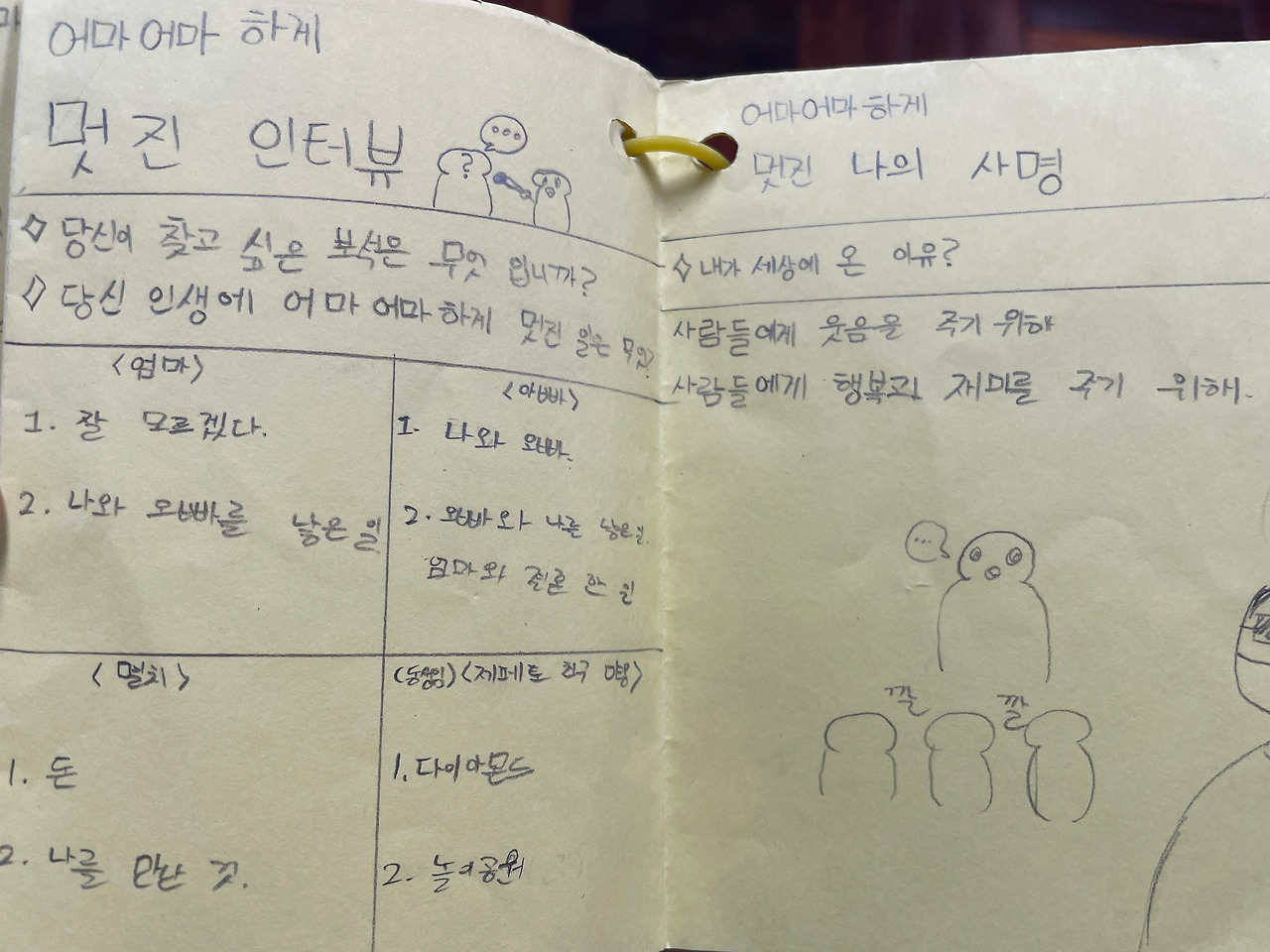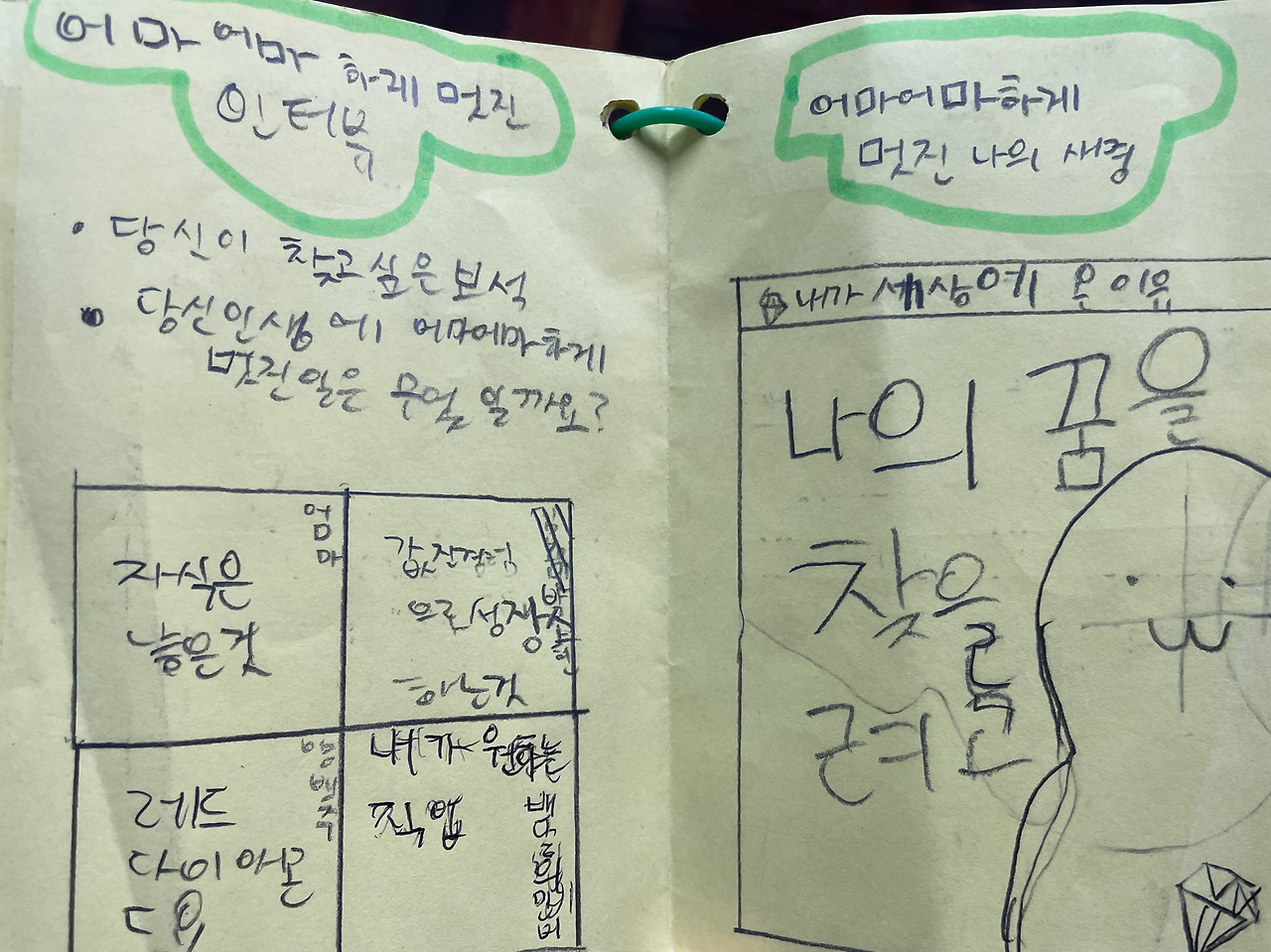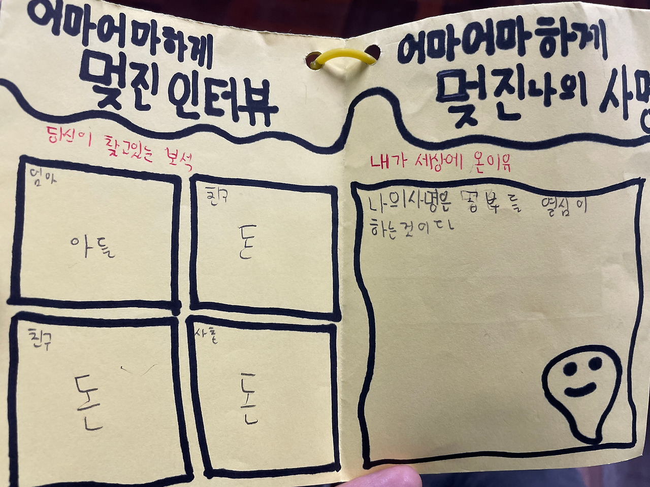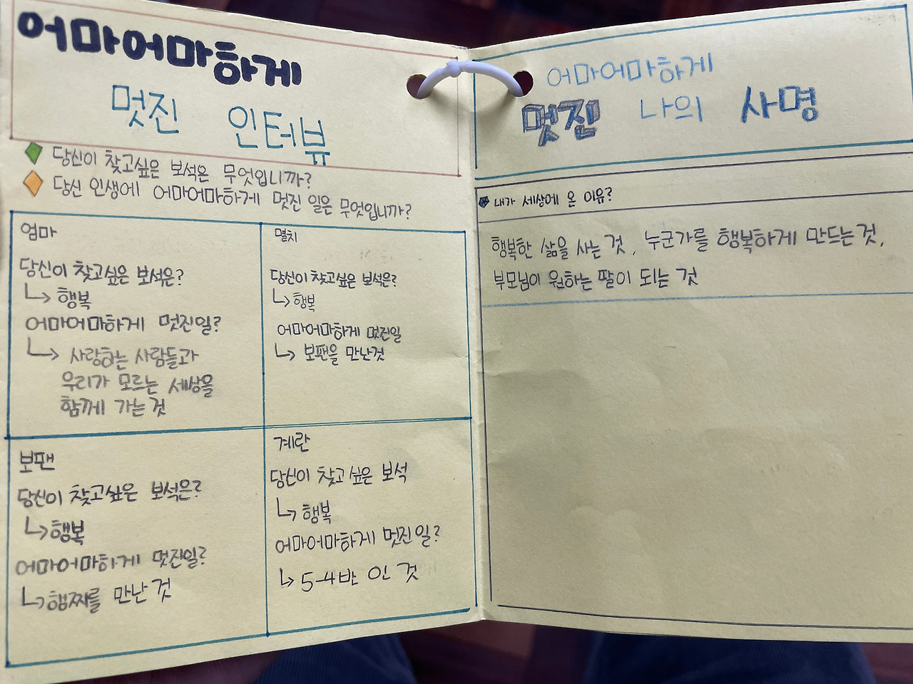 : 엄마가 찾고 싶은 보석은 '미래 저의 가족'이라고 하셨고, 어마어마하게 멋진 일은 '지금 행복한 우리 가족'이라고 하셨습니다.