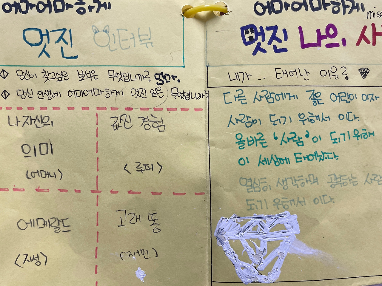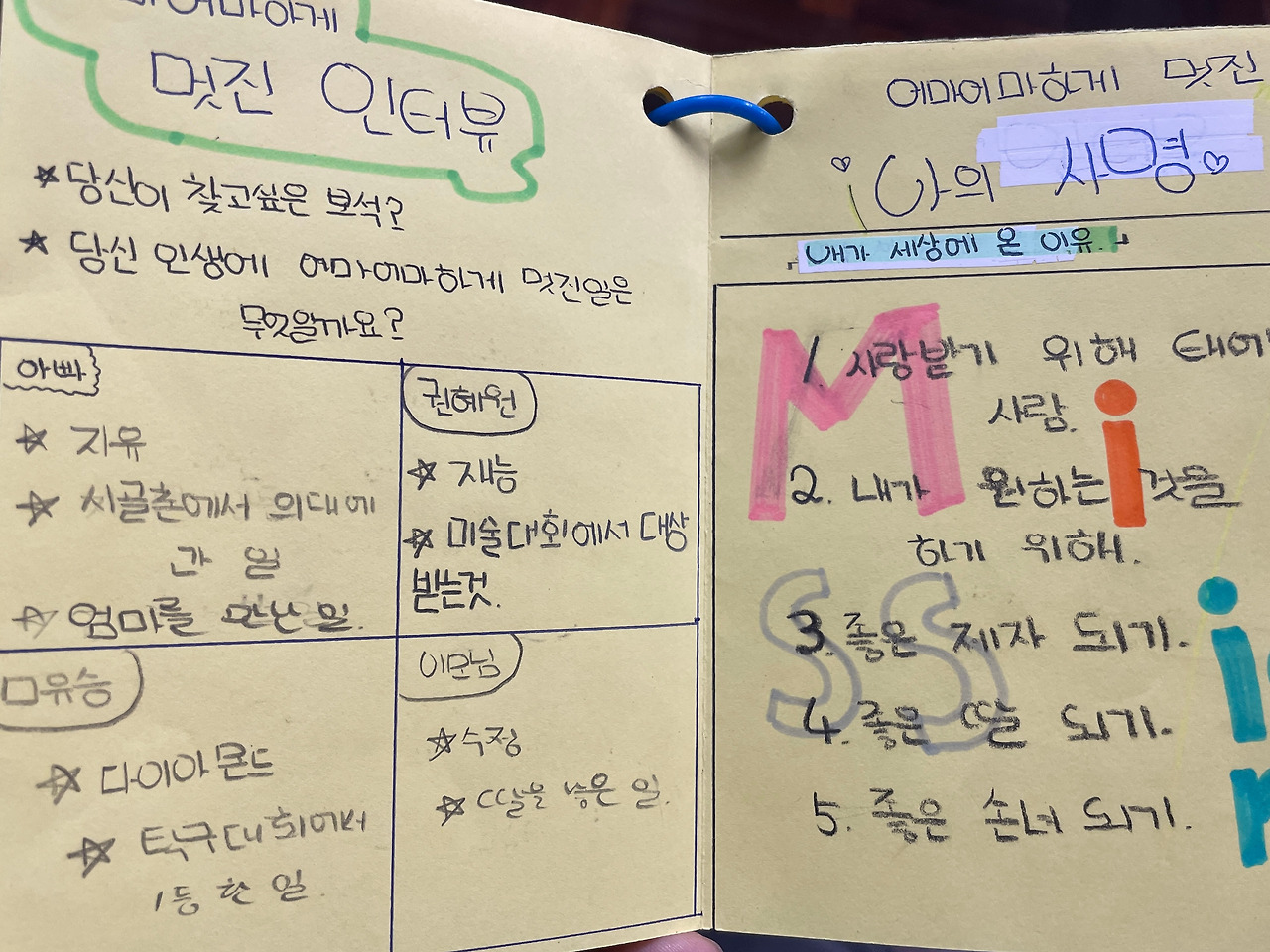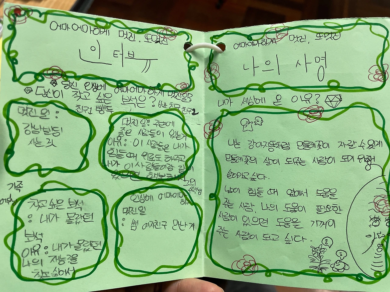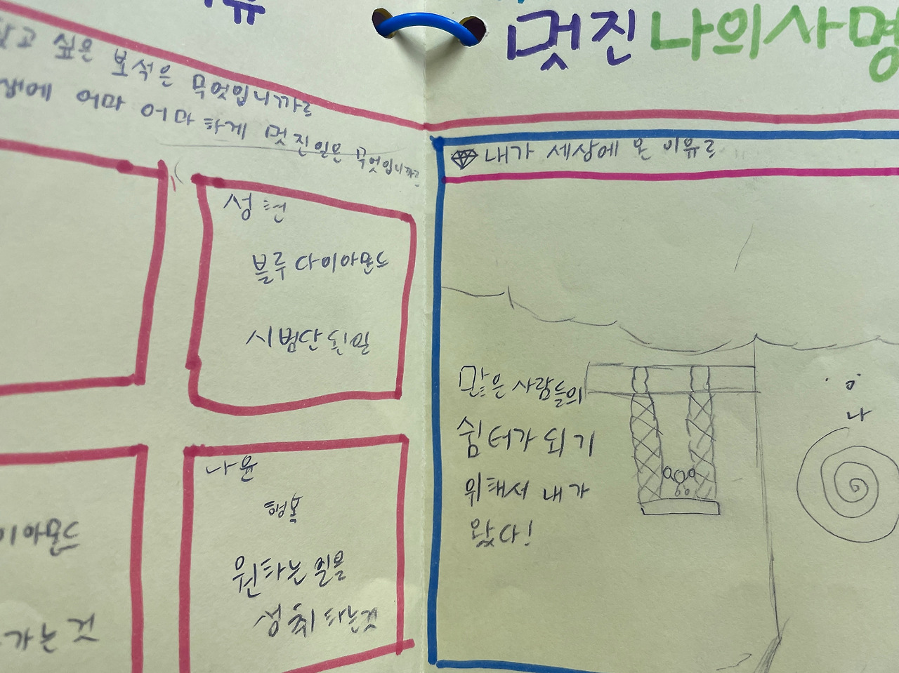 : (아이들은 진지하게 나의 이야기를 들어주었다.) 선생님의 이야기가 너희들의 사명을 생각하는 데 도움이 좀 되었을 거야. 자신이 세상에 온 이유를 나름 고민해 보고 적어봐.