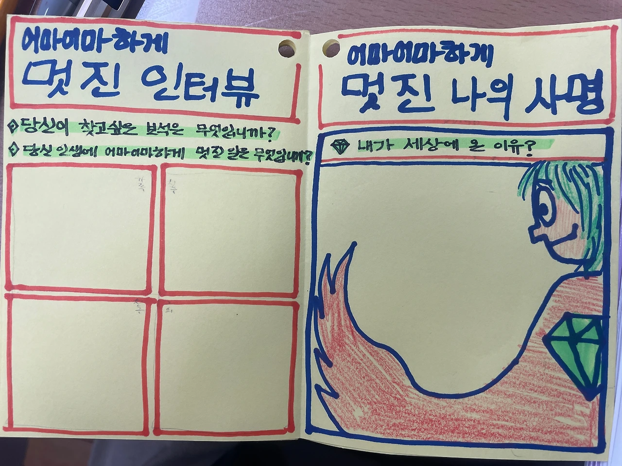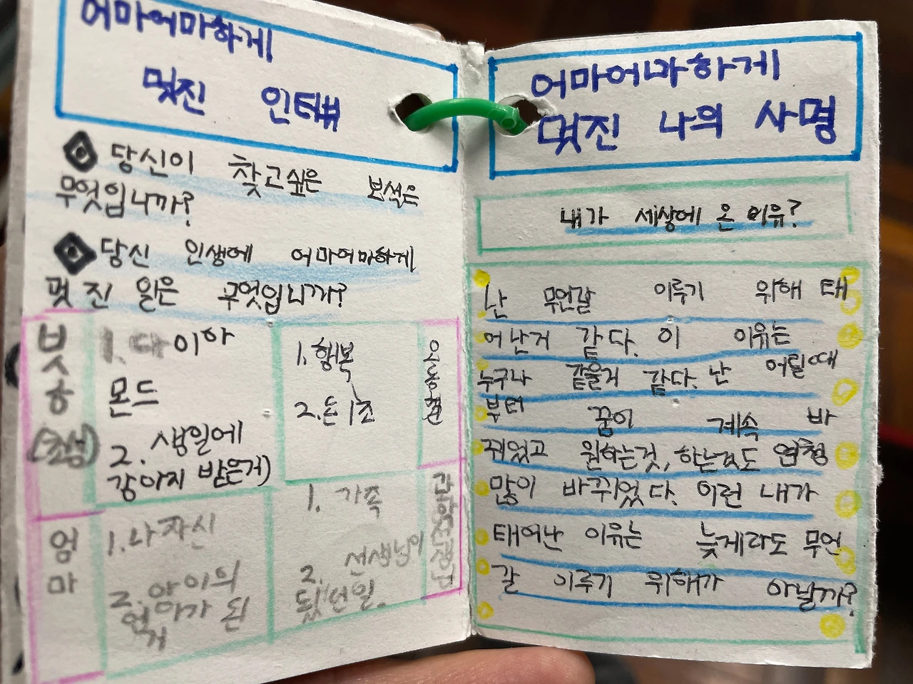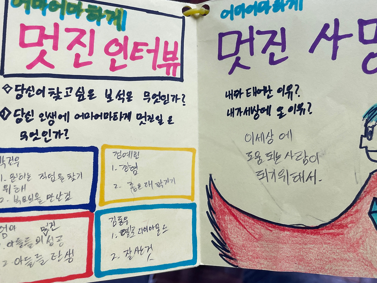 : (아이들은 진지하게 나의 이야기를 들어주었다.) 선생님의 이야기가 너희들의 사명을 생각하는 데 도움이 좀 되었을 거야. 자신이 세상에 온 이유를 나름 고민해 보고 적어봐.