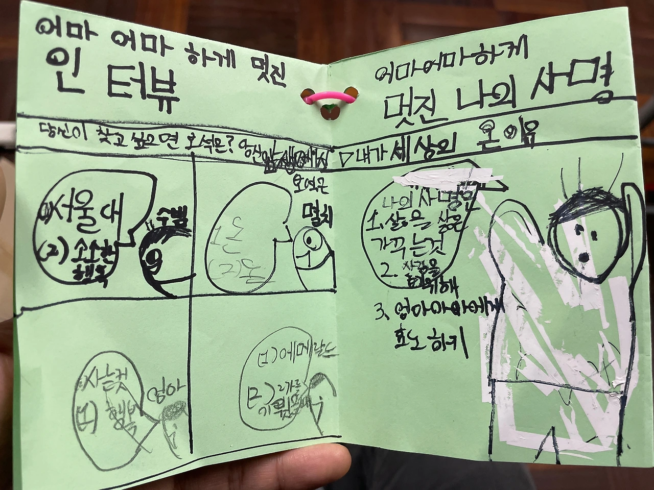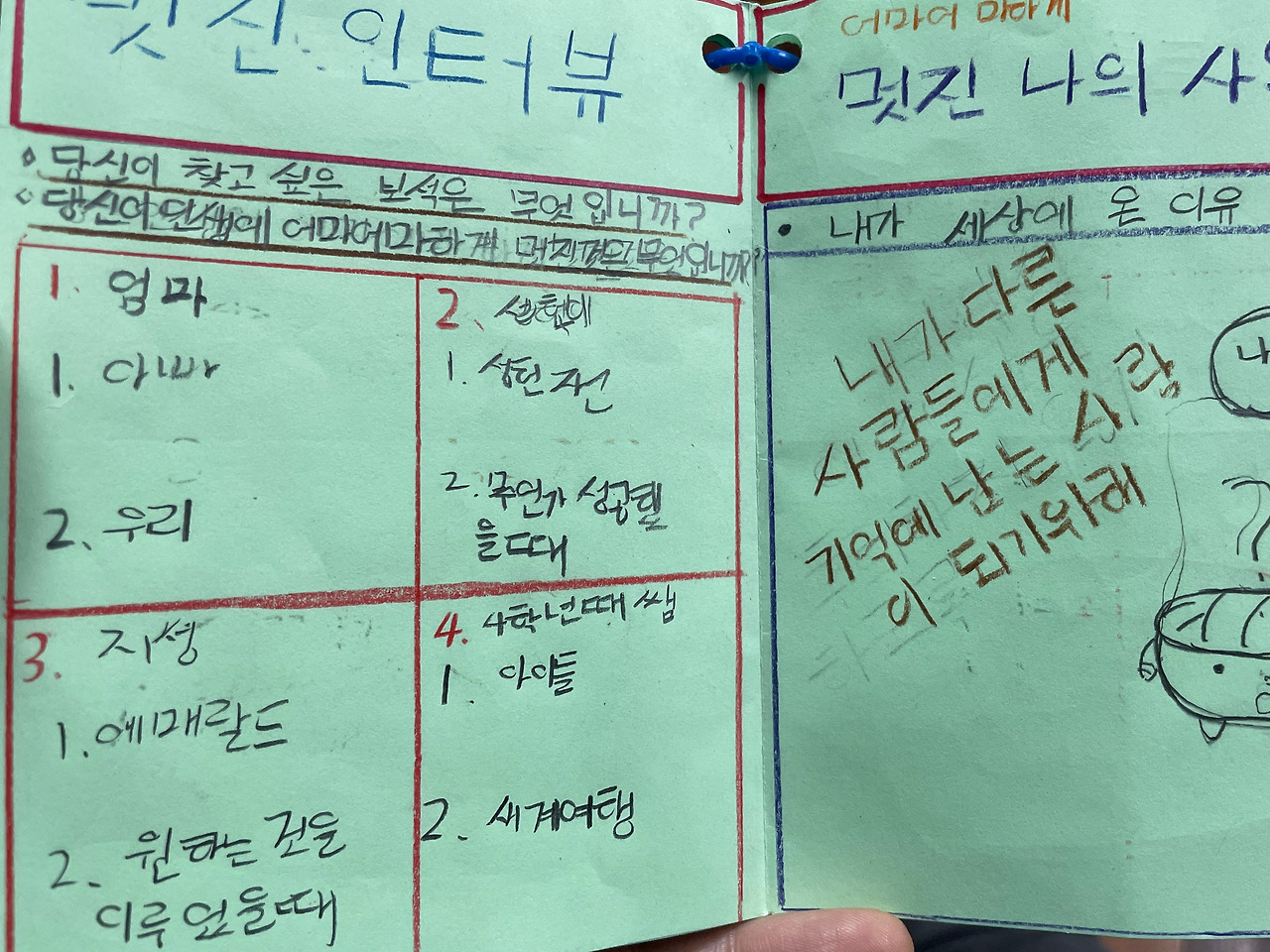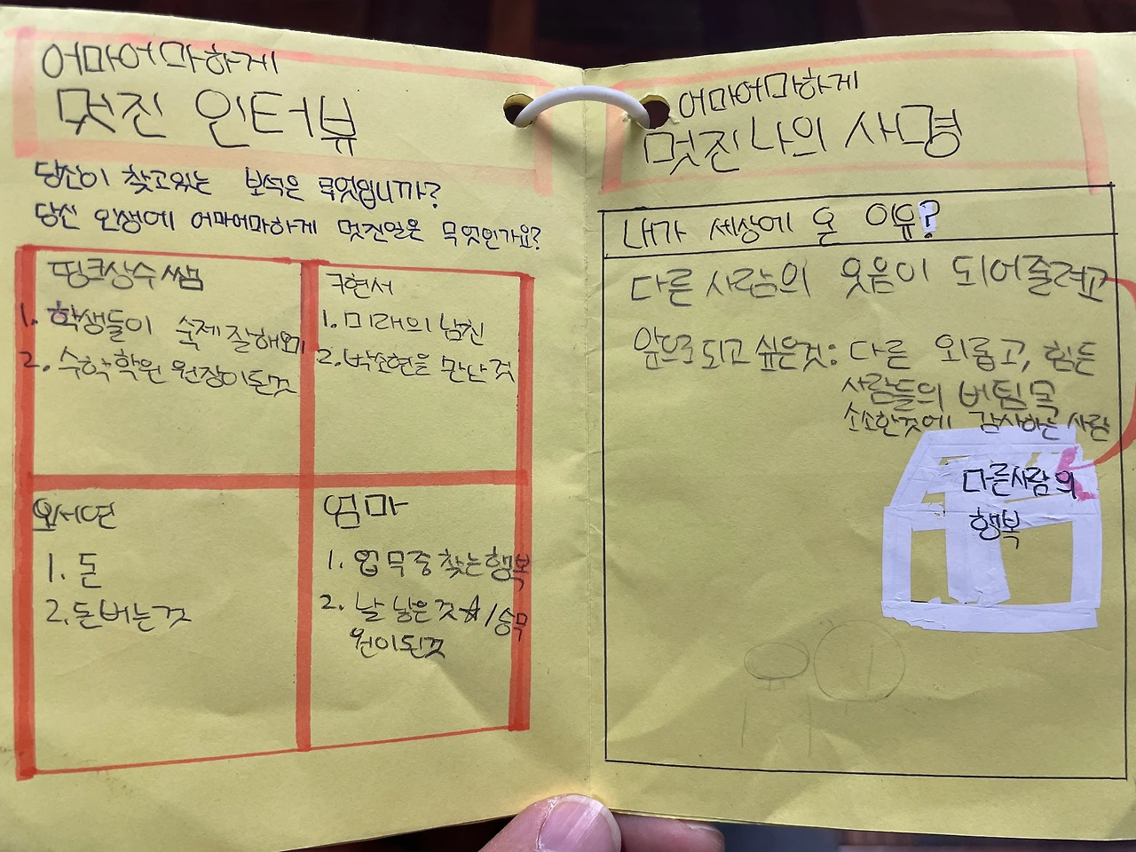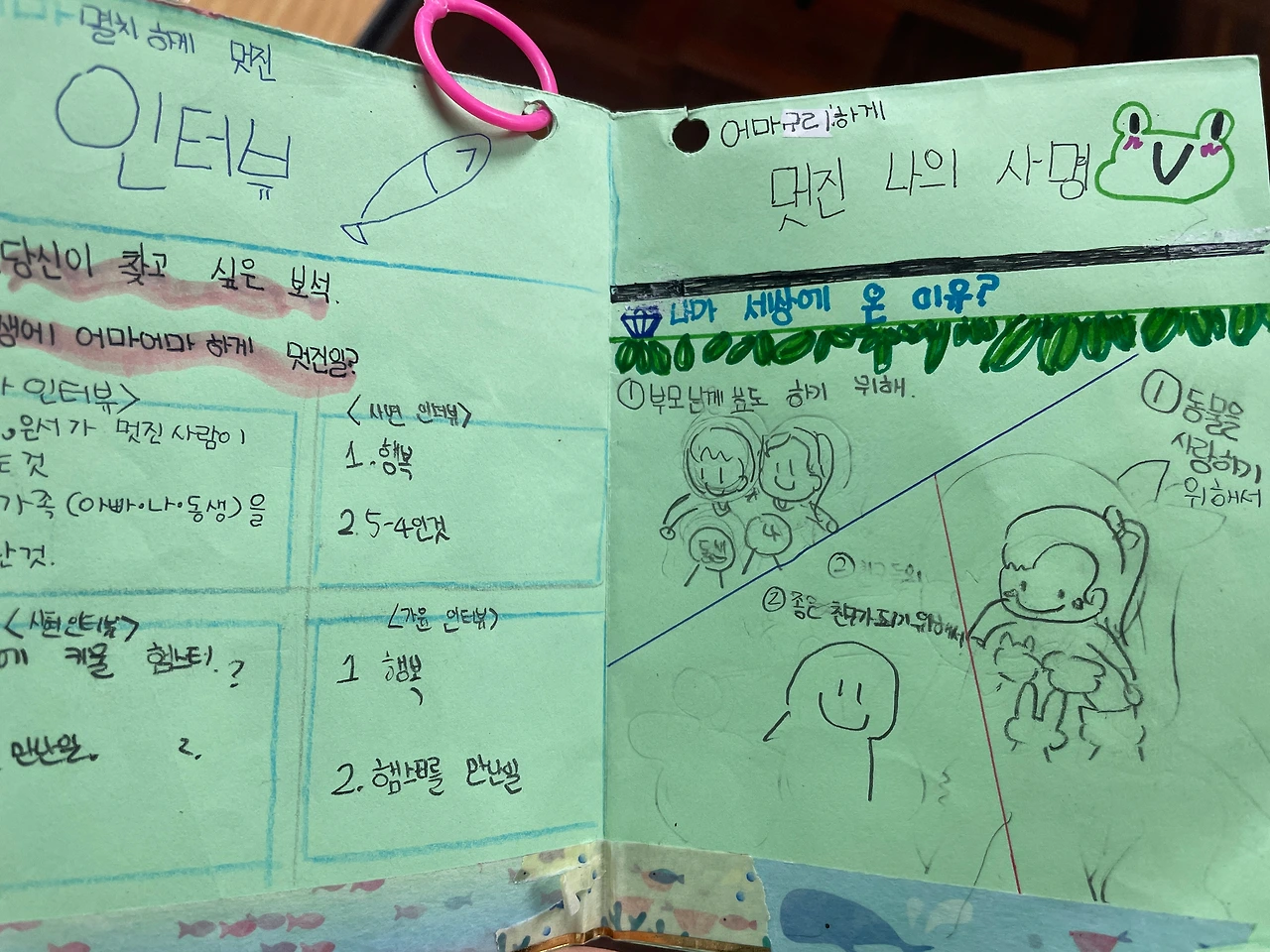 : (아이들은 진지하게 나의 이야기를 들어주었다.) 선생님의 이야기가 너희들의 사명을 생각하는 데 도움이 좀 되었을 거야. 자신이 세상에 온 이유를 나름 고민해 보고 적어봐.