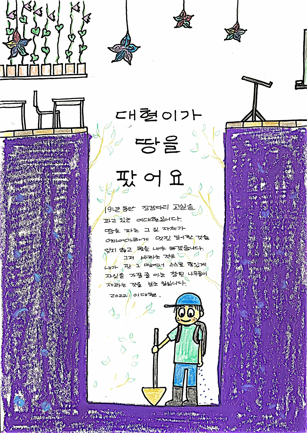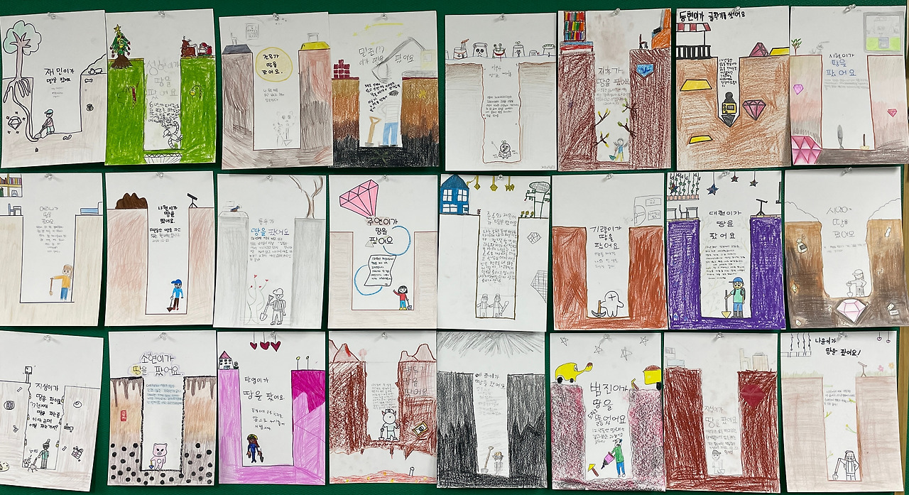 : 책으로 내 삶 가꾸기 수업을 마무리하는 시간이야. 선생님의 작품처럼 우리 각자의 이름을 넣어서 표지를 만들어 볼거야. '대현이가 땅을 팠어요', 'OO가 땅을 팠어요.', '@@가 땅을 팠어요.'처럼 제목에 자기 이름을 넣어 볼거야. 그리고 내가 무엇을 파고있는지, 어디를 파고 있는지 그림으로 표현할거야. 그리고 제일 중요한 것 제목 아래에 선생님이 쓴 글처럼 이 책과 관련해서 자신의 생각을 써주면 좋겠어.