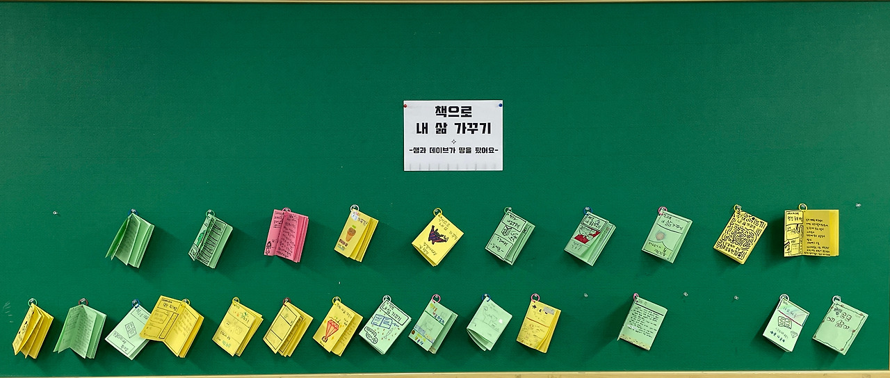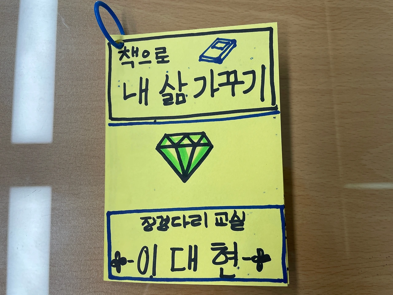 : 표지에 ‘책으로 내 삶 가꾸기’라는 제목과 ‘징검다리 교실 자기 이름’은 공통적으로 들어가야 해. 나머지 부분은 각자의 개성에 따라 꾸며주세요.