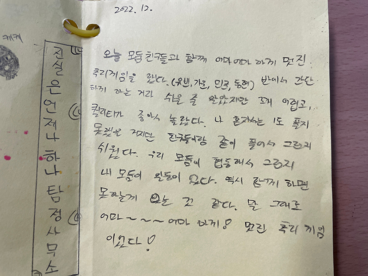 : 오늘은 어마어마한 멋진 추리게임을 배웠다. 미션을 받아서 이리저리를 돌아봤다. 미션을 한다고 힘들었지만 그래도 기분이 정말 좋았다. 오늘은 아주 좋은 추억이었다. 다음에도 이 게임을 또 하고싶다.