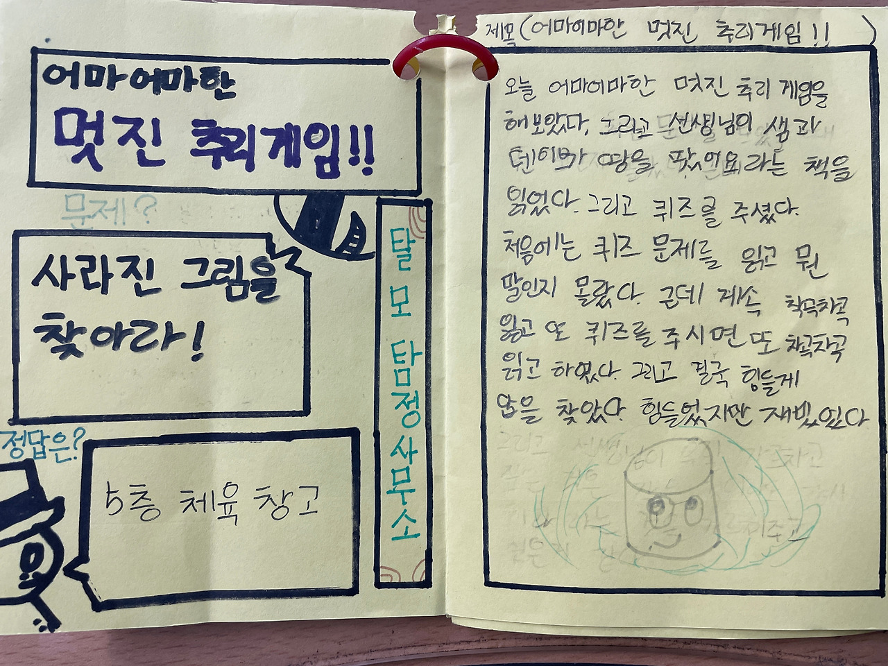 : 샘과 데이브가 땅을 팠어요라는 책을 읽고 어마어마하게 멋진 추리게임을 해보았다. 많은 추리가 필요한 시간이었는데, 운동장에서 힌트를 보고 처음과 끝이라 하던 내가 너무 한심하다는 생각도 들었다. 그리고 추리게임을 해서 그림을 들고 사진 찍는게 너무 뿌듯했다!
