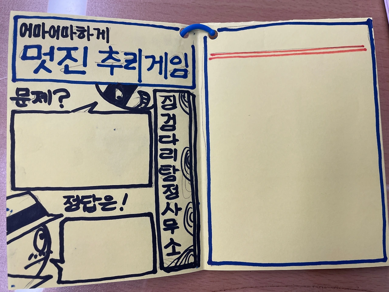 : 첫 번 째 활동으로 ‘어마어마하게 멋진 추리게임’을 해볼거야. 우선 선생님이 만든 것처럼 활동지를 한 바닥 만들고 시작하자. ‘어마어마하게 멋진 추리게임’이라는 제목과 문제, 정답을 쓰는 칸, 그리고 탐정사무소 이름 쓰는 칸은 고정이고 나머지 디자인은 자유롭게 하면 됩니다. 여러분 각 모둠이 하나의 탐정사무소가 될거야. 모둠 친구들끼리 탐정사무소의 이름을 정하고 활동지를 완성해 주세요. 시간은 5분!