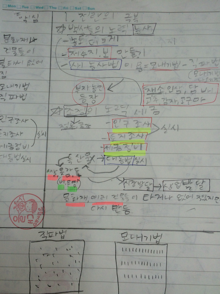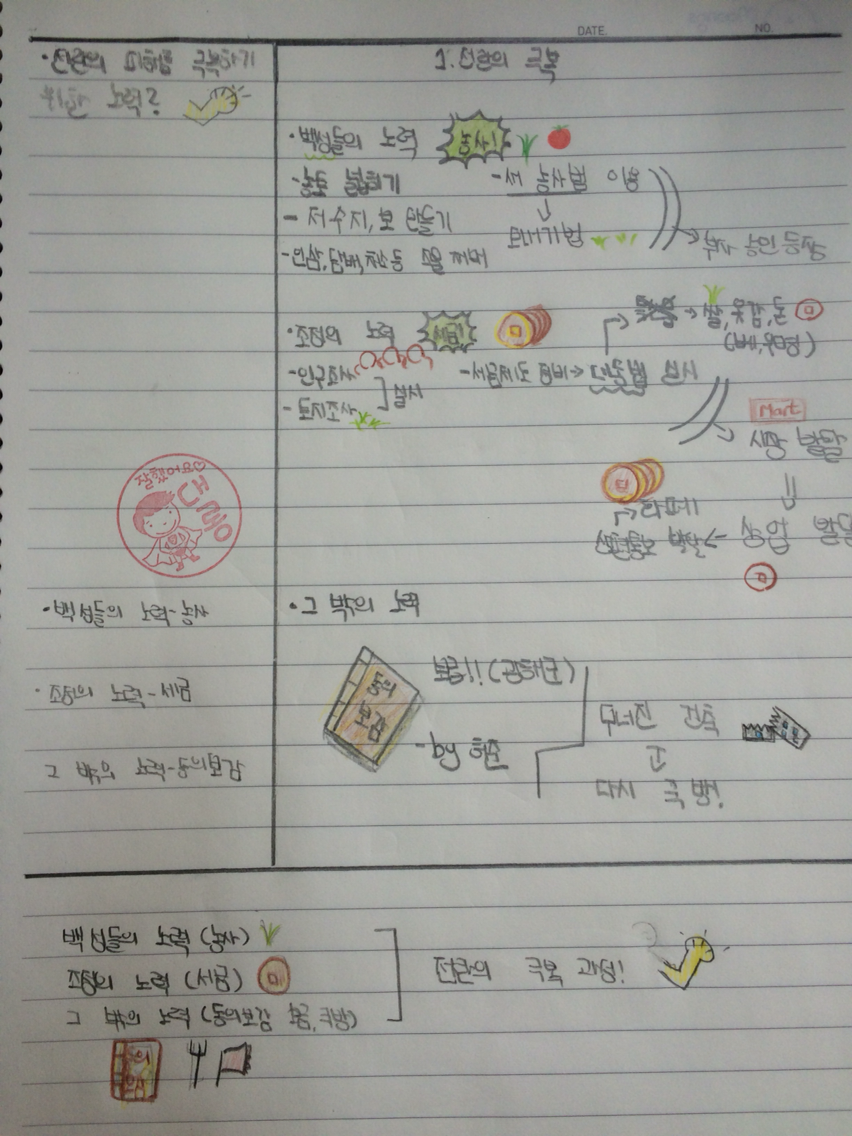 : 미리 선생님 말에 맞장구만 쳐주라고 역할을 주었던 아이와 소작농의 입장에서 역할극을 진행한다. 그래서 농민이 할 수 있는 것은 농사를 짓는 일이라는 것을 끌어낸다. 그리고 즉흥극을 진행하며 내용을 전한다.