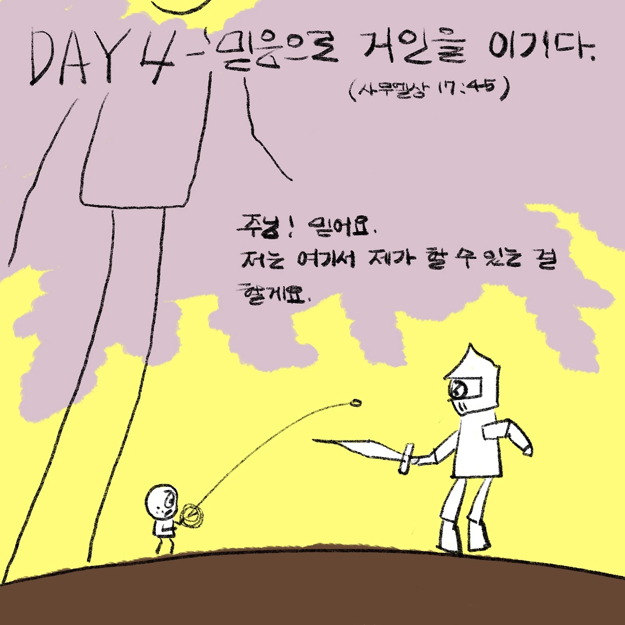 그럼 나는 나의 앞에 선 골리앗을 만날 때면 어떻게 해야 하나? 골리앗이든 사자든 곰이든 이리든 여우든.. 내 앞에 그런 종류의 두려움이 나타낼 때마다 내게 주어진 미션이라 생각하고 내가 할 수 있는 최선을 해야 할 것이다. 두려움이 내 앞에 모습을 드러낼 때마다 ‘내가 이길 수 없지만, 하나님이 하실 거야. 하나님이 이기게 하실 거야.’하는 믿음의 마음을 품는 훈련을 해야 하겠다. 때론 그 두려움 앞에서 실패하고 좌절하고 낙심도 하겠지만, 내 마음 속에서 ‘하나님이 건져주실 거야!‘하는 믿음을 두려움과 바꾸는 연습, 마음의 훈련을 해야 하겠다. 그리고 그 상황에서 내가 할 수 있는 한 걸음을 내딛는 것. 내가 던질 수 있는 물맷돌을 던지는 것. 내 뒤에 서계시는 하나님을 믿고 내 앞의 두려움에 맞서 내가 할 수 있는 것을 하며, ’하나님 뜻대로 인도해 주세요.‘하는 마음을 가지는 것이 내가 해야 할 과제다.