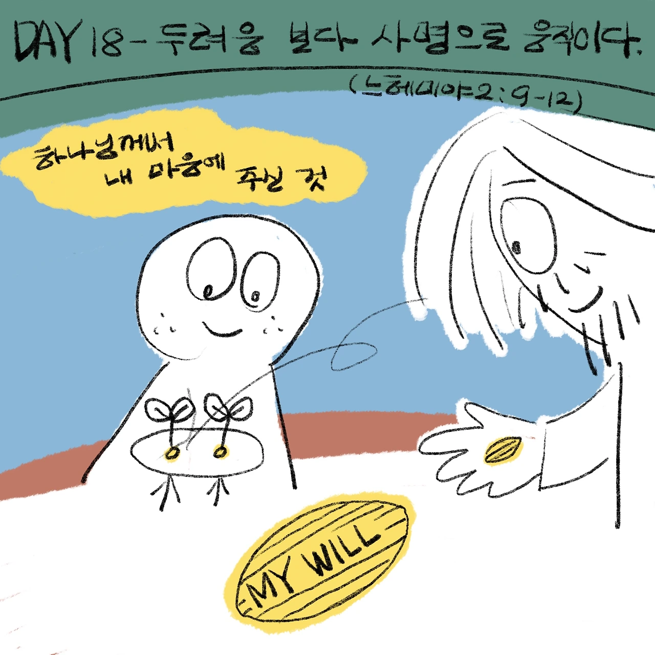 느헤미야는 무너진 성을 재건하고 싶은 바람을 왕께 고하고 실천하고 있다. 그 바람을 느헤미야는 ‘하나님께서 내 마음에 주신 것’이라고 표현하고 있다. 느헤미야가 하고 싶지 않았던 일을 하라고 시키신 것이 아니라, 느헤미야의 마음 속에 자연스럽게 하고 싶은 일로 싹을 틔워 주신 것, 하나님의 뜻을 이루기 위해 느헤미야의 마음 속에 ‘소원’으로 심어주신 것이다. 그 실천을 느헤미야는 하기 시작했고, 여러 어려움 가운데에도 하나님은 그 뜻을 이루기 위해 느헤미야를 형통케 하실 것이다.