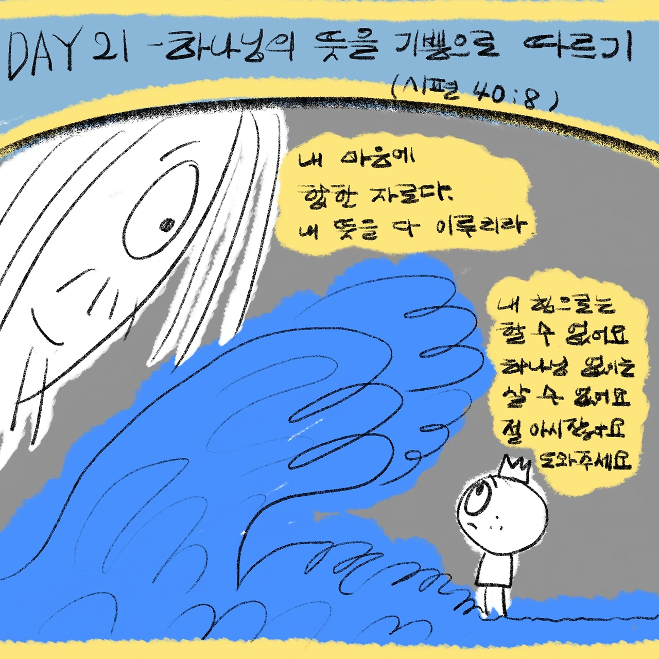 “하나님, 이 파도 너무 세요. 하나님께서 인도해 주세요. 이 파도를 통해 일하시는 하나님을 믿어요. 사실 하나님 말고는 제가 할 수 있는 일이 없다는 것도 잘 알아요. 그러니 하나님, 도와주세요. 저는 오늘 저에게 주어진 내 삶을 충실히 가꾸어 보겠습니다. 내 눈 앞에 있는 파도를 믿는 사람답게 조금씩 넘어볼게요. 이 파도를 잠재워 주세요. 그러나 내 뜻대로 마옵시고, 하나님 아버지 뜻대로 하옵소서. 이렇게 하나님께 붙어 있는 게 즐거워요. 나 하나님이 좋아요. 도와주세요.“