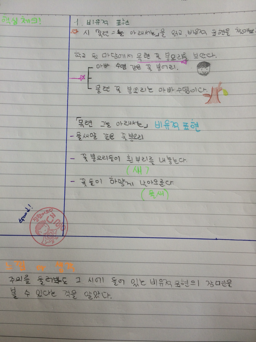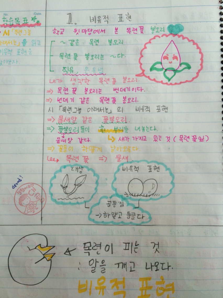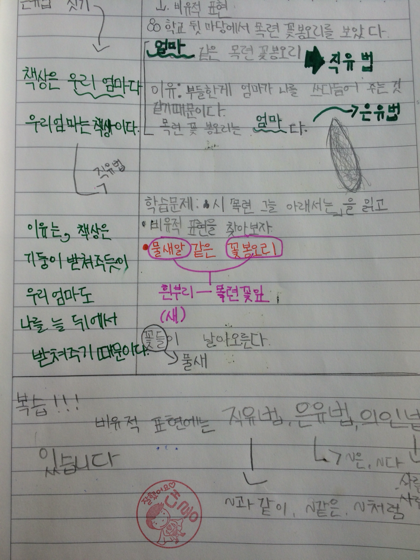 공책을 다시 펴서 '학교 뒷마당에서 목련 꽃봉오리를 보았다.'라고 쓰고 직유법과 은유법의 형식으로 표현해 본다.