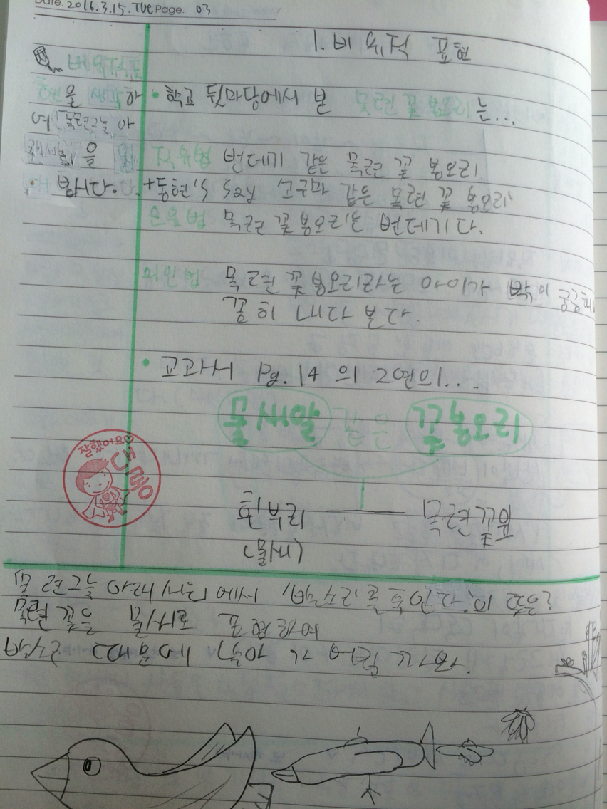 : '물새알같은 꽃봉오리'는 오늘 보았던 꽃봉오리로는 연결이 힘들어 보여 교과서에 나와 있는 그림을 참고하니 잘 이해했다.