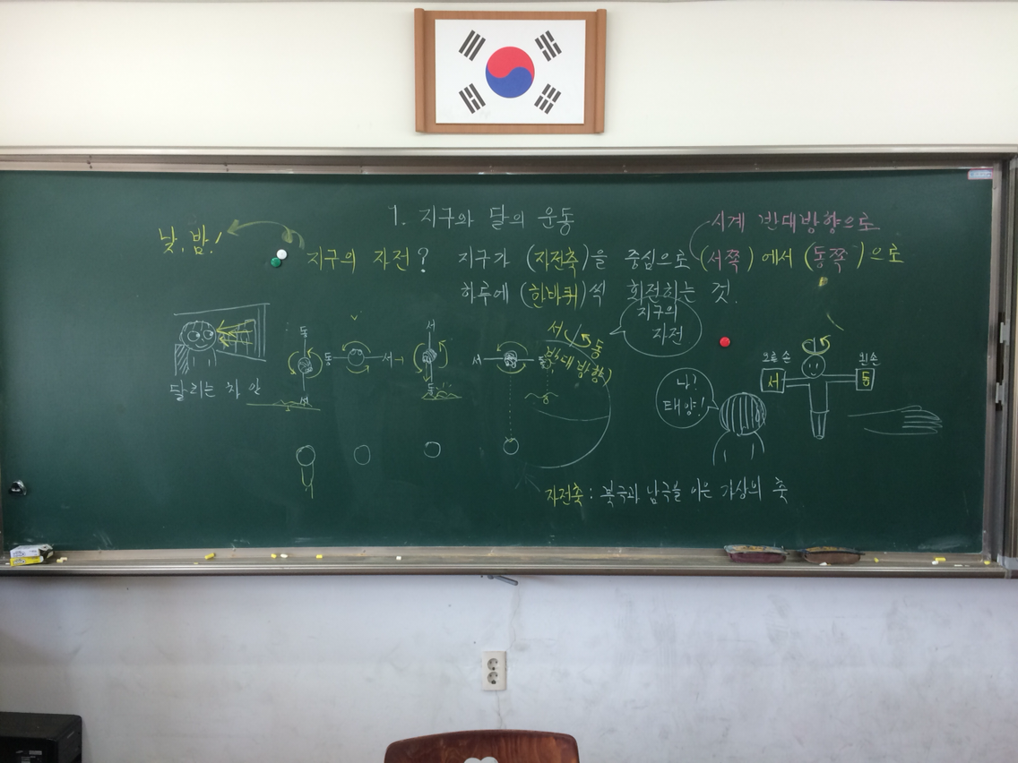 - 지구는 돕니다. 두 가지 방식으로 돌지요. 하나는 자전이고 다른 하나는 공전입니다. : 동작으로 자전과 공전을 보여준다.