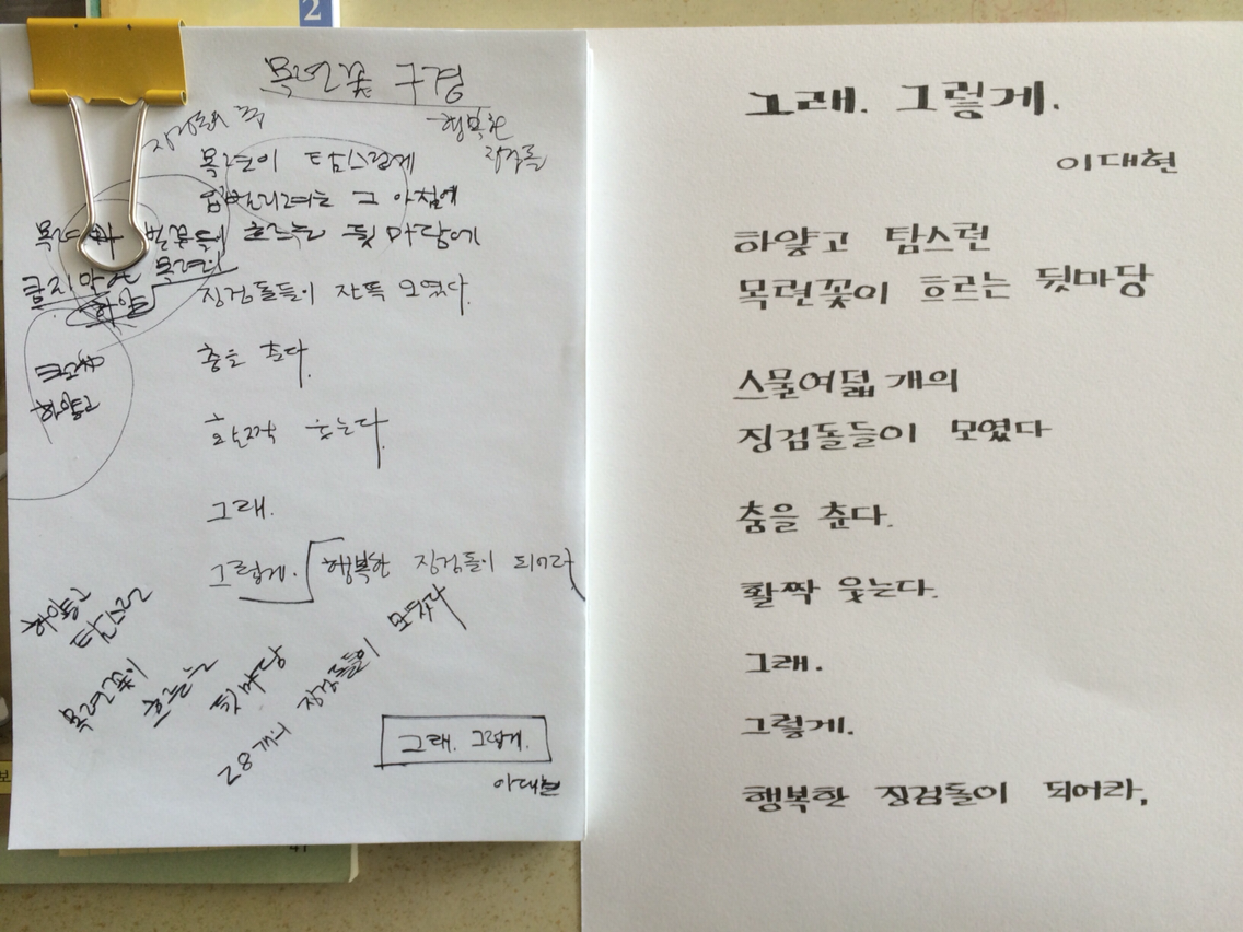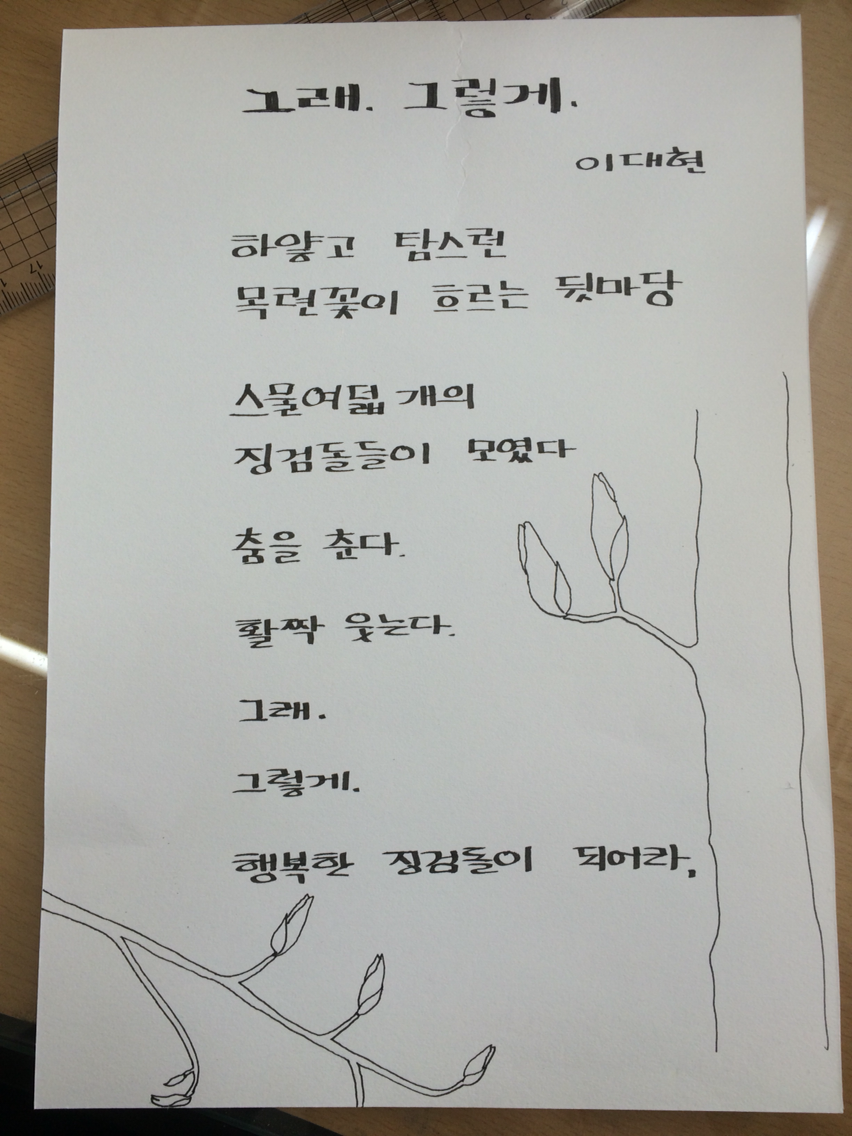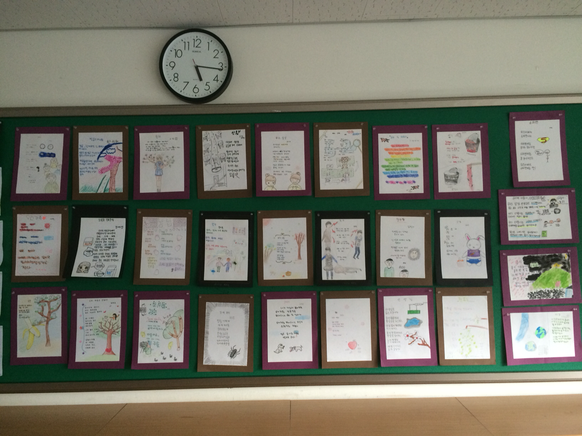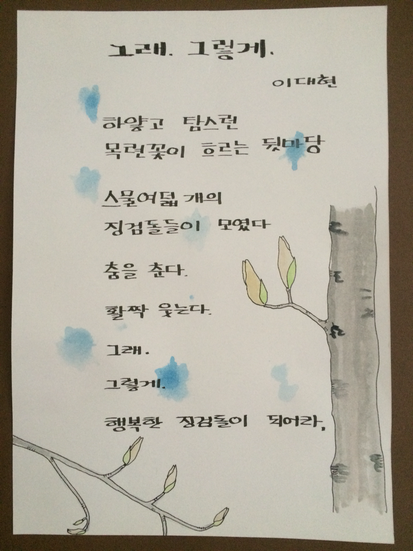 - 시를 다 쓴 사람은 공책을 가지고 와 내게 보이고 시화를 그릴 종이를 받아간다. 다들 좋은 시를 쓴다.