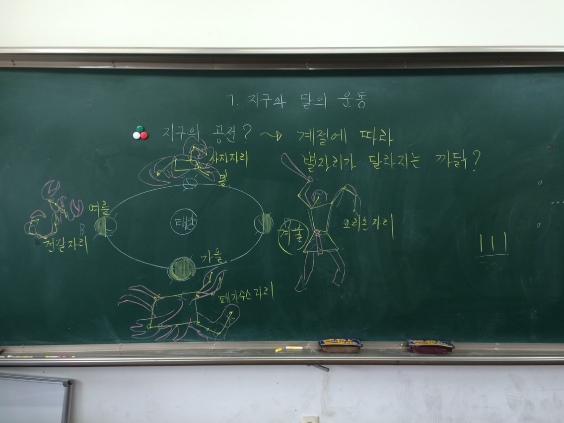 - 선생님이 3~4분 정도 시간을 줄거야. 그리곤 여기서 공전과 자전을 시작할거야. 그럼 너희들은 계절별 별자리를 직접 표현해야 해. 너희 뭐할래? 페가수스!! 그럼 여기가 가을이다. 너희들은 그럼 뭐해야 되노? 전갈! 아니지.. 공전방향을 생각해 봐라. 오리온!! 그래 너희는 겨울이니까. 너희들은? 사자!! 봄!! 그래. 칠판쪽은 그럼 뭐고? 전갈자리!! 여름!!