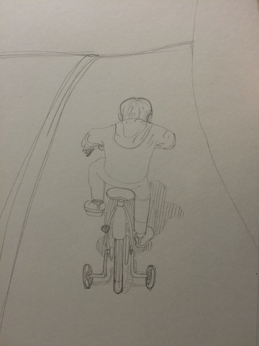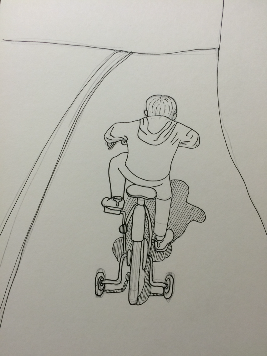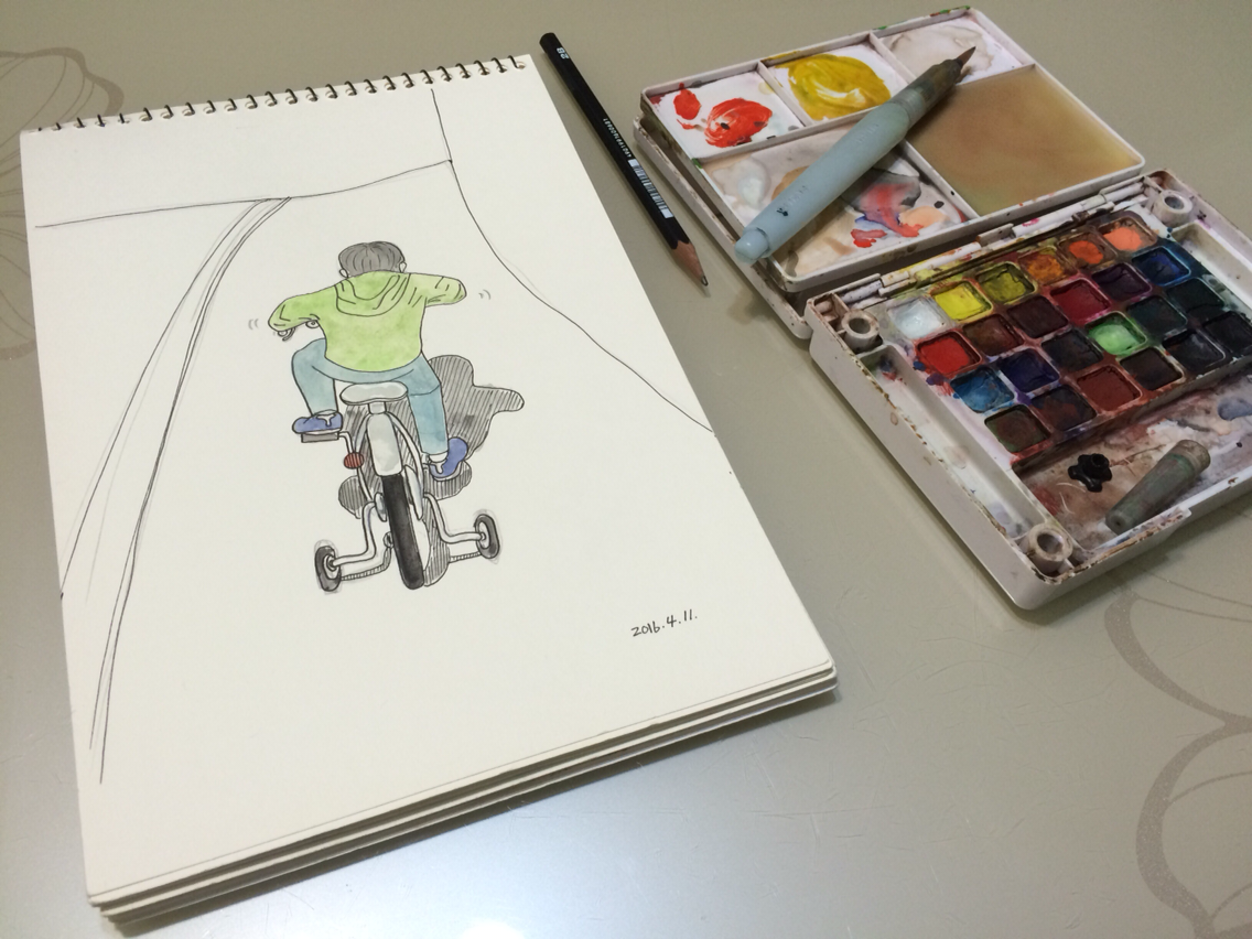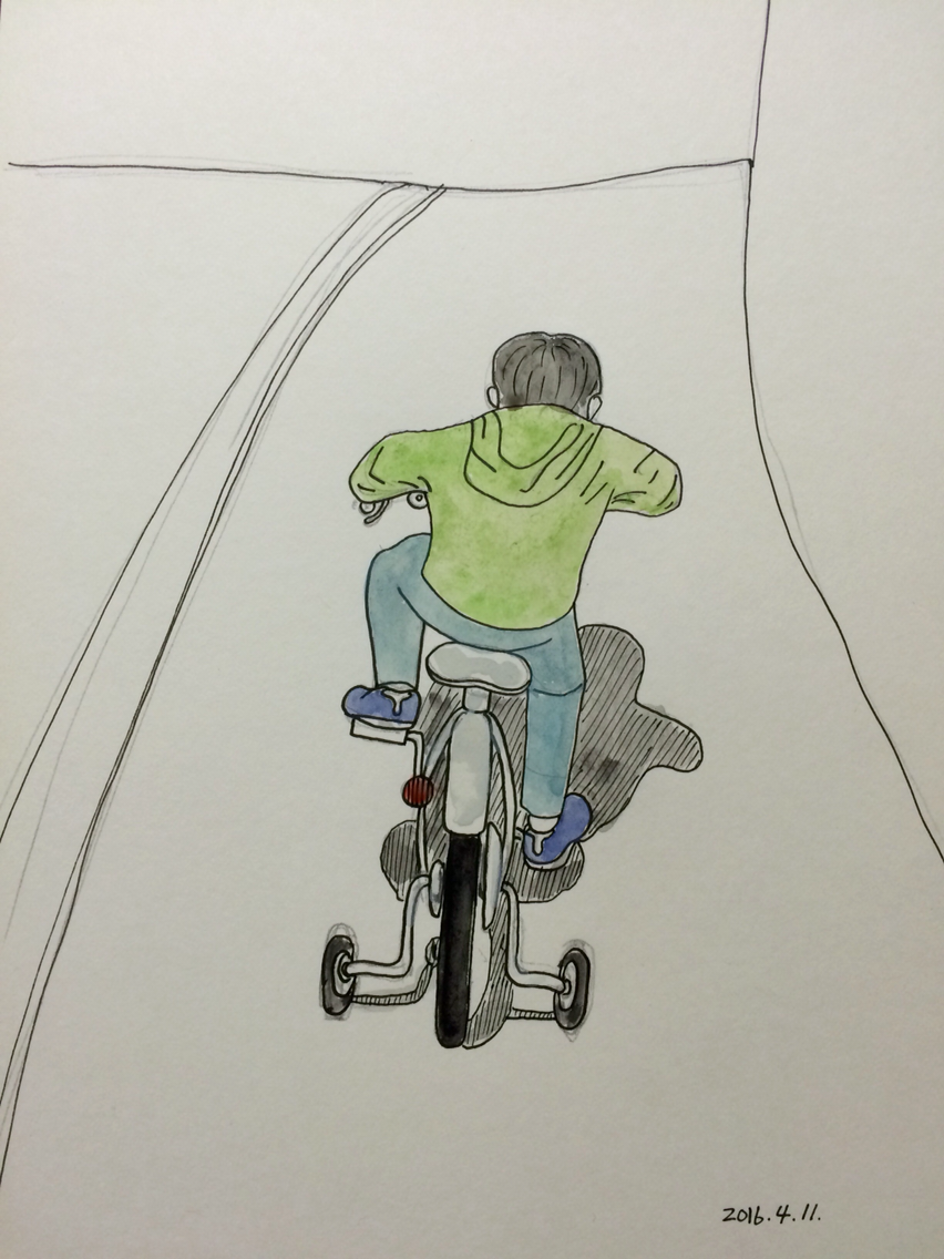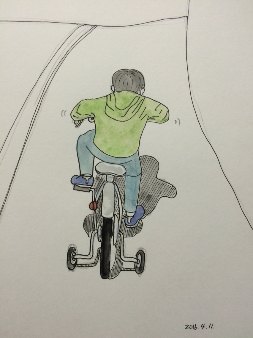 누나가 두발자전거 연습을 한다고 보조바퀴를 뺄 때, 자기 것도 빼달라던 겸이.