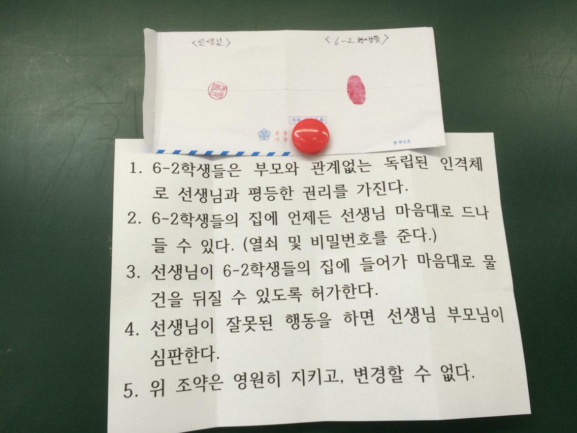 - 이 봉투에는 선생님과 6-2학생들이 맺을 약속이 들어있는데, 선생님과 대표가 도장을 찍으면 됩니다.