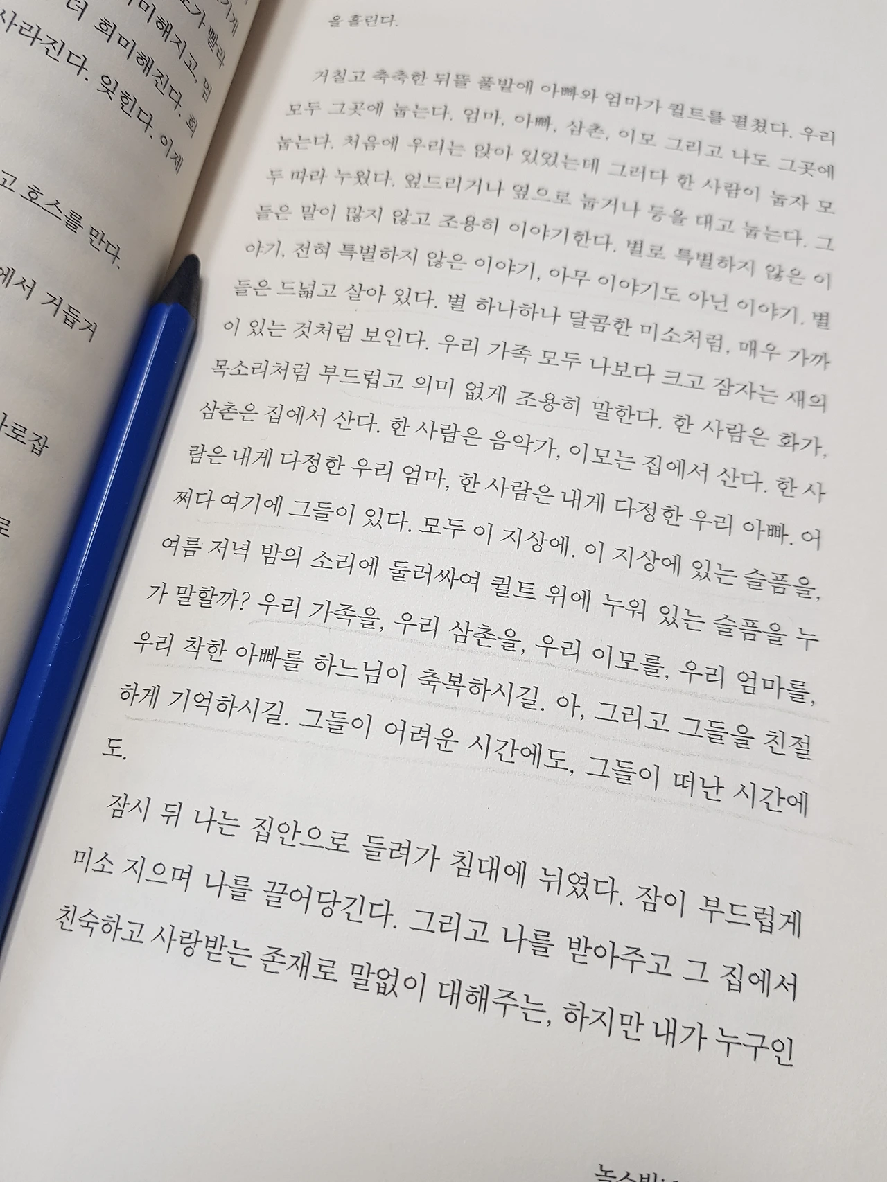 거칠고 축축한 뒤뜰 풀밭에 아빠와 엄마가 퀼트를 펼쳤다. 우리 모두 그곳에 눕는다. 엄마, 아빠, 삼촌, 이모 그리고 나도 그곳에 눕는다. 처음에 우리는 앉아 있었는데 그러다 한 사람이 눕자 모두 따라 누웠다. 엎드리거나 옆으로 눕거나 등을 대고 눕는다. 그들은 말이 많지 않고 조용히 이야기한다. 별로 특별하지 않은 이야기, 전혀 특별하지 않은 이야기, 아무 이야기도 아닌 이야기. 별들은 드넓고 살아 있다. 별 하나하나 달콤한 미소처럼, 매우 가까이 있는 것처럼 보인다. 우리 가족 모두 나보다 크고 잠자는 새의 목소리처럼 부드럽고 의미 없게 조용히 말한다. 한 사람은 화가, 삼촌은 집에서 산다. 한 사람은 음악가, 이모는 집에서 산다. 한 사람은 내게 다정한 우리 엄마, 한 사람은 내게 다정한 우리 아빠. 어쩌다 여기에 그들이 있다. 모두 이 지상에. 이 지상에 있는 슬픔을, 여름 저녁 밤의 소리에 둘러싸여 퀼트 위에 누워 있는 슬픔을 누가 말할까? 우리 가족을, 우리 삼촌을, 우리 이모를, 우리 엄마를, 우리 착한 아빠를 하느님이 축복하시길. 아, 그리고 그들을 친절하게 기억하시길. 그들이 어려운 시간에도, 그들이 떠난 시간에도.