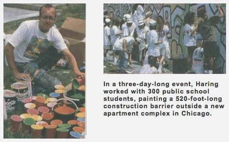키스 해링은 300명의 공립학교 아이들과 158m 너비의 작품을 만들었으며 1000명의 아이들과 27m 너비의 벽화를 그리기도 했습니다. 해링은 아이들과 함께 작업할 때 매우 행복해했습니다.