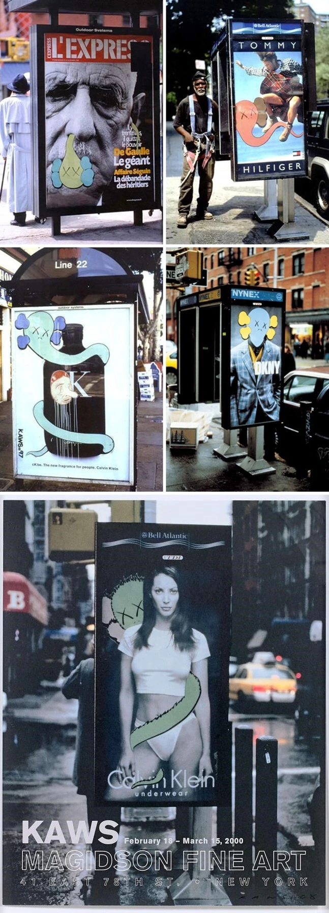 1974년 뉴저지에서 자란 KAWS의 본명은 브라이언 도넬리(Brian Donnelly)입니다. 뉴욕의 스쿨 오브 비주얼 아트(SVA)에서 학사학위를 받은 그는 잠깐 디즈니에서 애니메이터 프리랜서로 근무한 뒤 90년대 초반에는 거리의 버스정류장이나 공중전화의 광고에 그림을 그려 넣기 시작하며 사람들에게 알려졌습니다. 2000년대 자신의 개인전이 열릴 때 이 이미지를 사용해 포스터를 만들기도 했습니다.