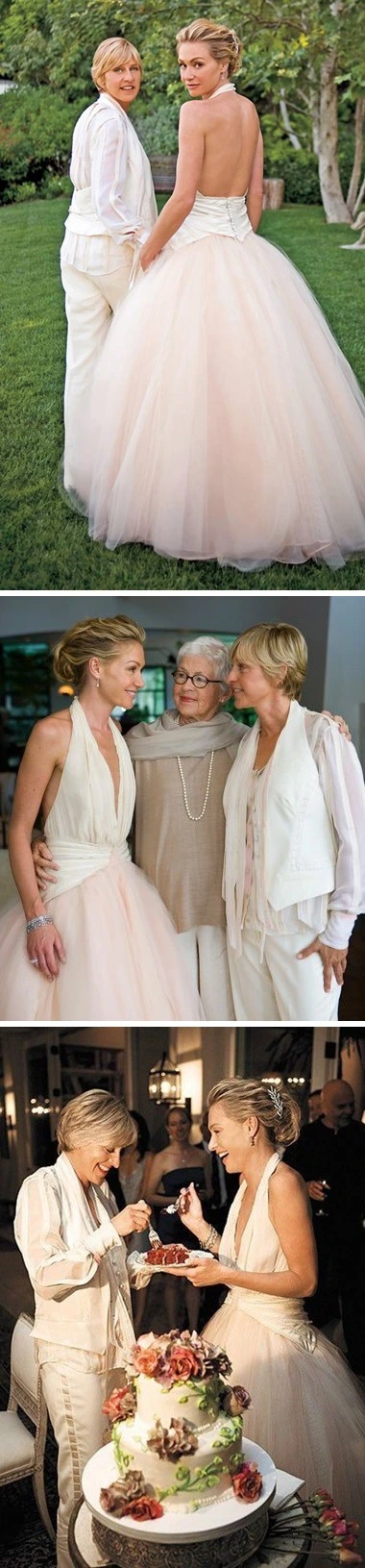 2008년 미국의 유명 토크쇼 진행자인 엘렌 드제너러스와 호주 출신의 배우 포샤 드 로시가 결혼했습니다. 엘렌 드제너러스와 포샤 드 로시는 잭 포센의 턱시도와 드레스를 입었으며 특히 드 로시의 웨딩드레스는 마릴린 먼로를 연상시키는 홀터넥 스타일로 주목받았습니다.