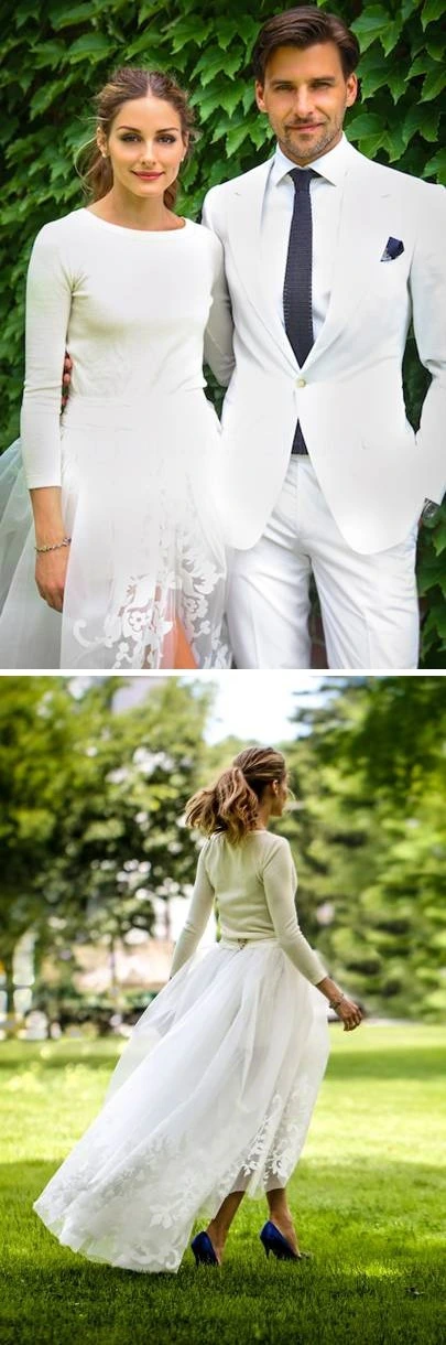 미국 드라마 '가십걸'의 실제 모델로도 유명한 올리비아 팔레르모는 뉴욕 재벌 더글라스 팔레르모의 딸입니다. 평소 패션아이콘으로도 유명한 올리비아 팔레르모는 캐롤리나 헤레라(Carolina Herrera)의 웨딩드레스를 입었는데, 이 드레스는 캐시미어 풀오버와 튤 스커트로 구성되어 있어 원피스(One-Piece)로 이뤄진 웨딩드레스 시장에 엄청난 반향을 불러일으켰습니다. 또한 아이보리색 웨딩슈즈 대신 마놀로 블라닉의 블루 컬러 슈즈를 웨딩슈즈로 선택해 트렌디한 그녀의 안목을 엿볼 수 있었습니다.