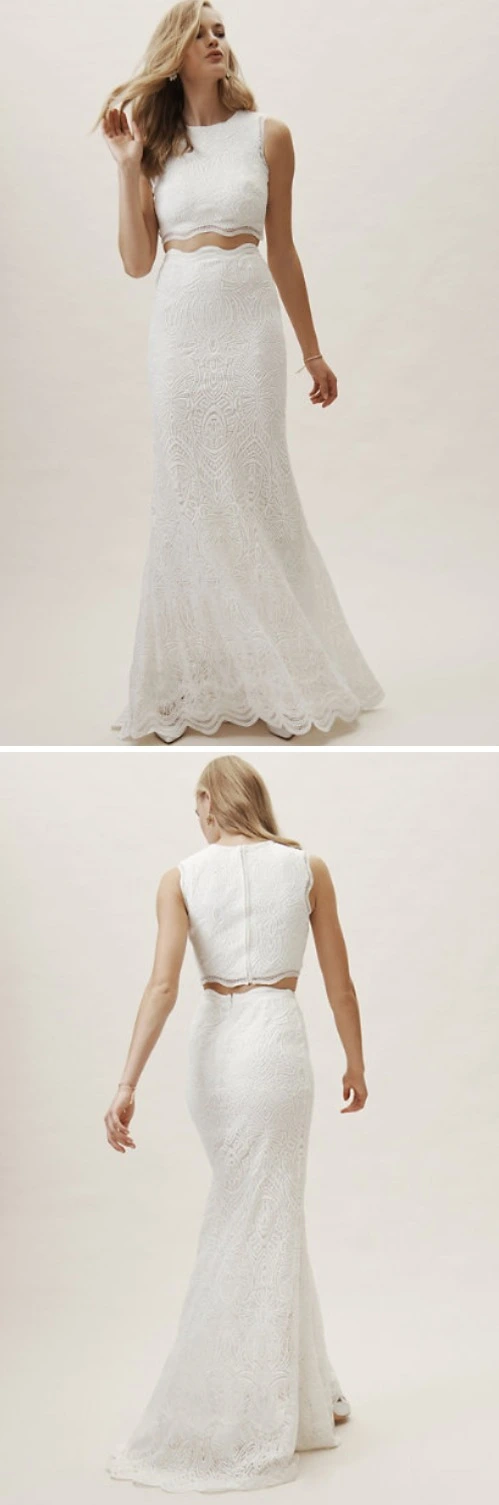 비홀든이라고 불리는 BHLDN은 미국에서도 가성비가 뛰어나기로 소문난 드레스샵입니다. 빈티지 로맨틱 드레스가 많은 이 곳에서는 Bridal Separates라는 라인업을 만들어 스커트와 탑을 직접 고를 수 있도록 했습니다. 이 중 가장 눈에 띄는 것은 Campbell Dress + Top인데 탑과 스커트 절개부분을 스캘럽트 라인(조개껍데기를 늘어놓은 물결모양)으로 만들어 독특함을 더했습니다.