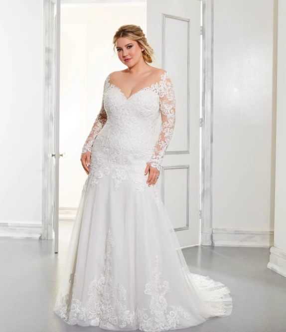 긴팔 웨딩드레스가 뚱뚱해 보인다는 것은 반은 맞고 반은 틀린 것입니다. 과감한 네크라인과 시어한 소재의 소매는 신부의 우아함을 더해줍니다.