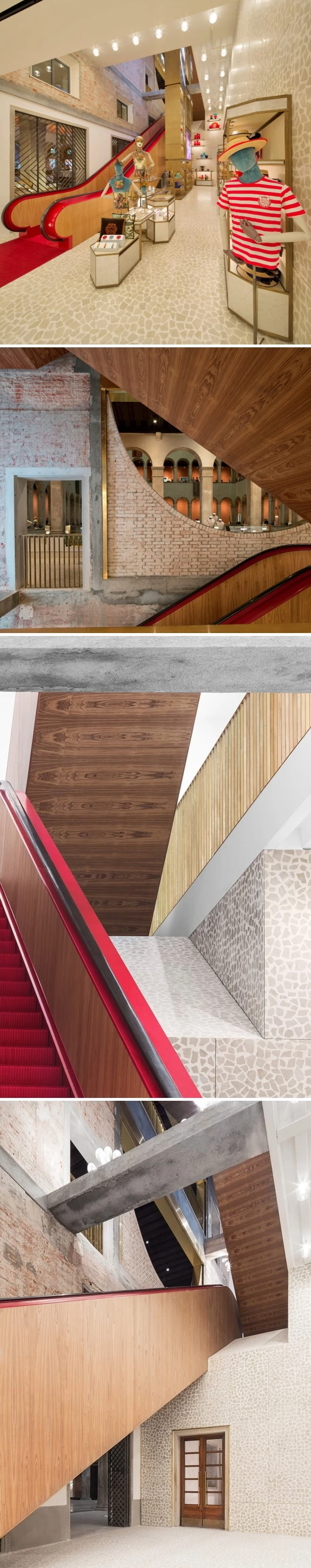 폰다코 데이 테데스키 백화점은 원래 1228년에 지어진 건물입니다. 2016년 렘 콜하스(Rem Koolhaas)는 이곳을 모던하게 변신시켜 백화점으로 만들었으며 이 에스컬레이터도 이때 새 단장을 하게 되었습니다. 흡사 런웨이와도 같은 이 에스컬레이터는 레드 컬러를 주로 사용하였으며 나무 패널로 클래식함을 더했습니다.