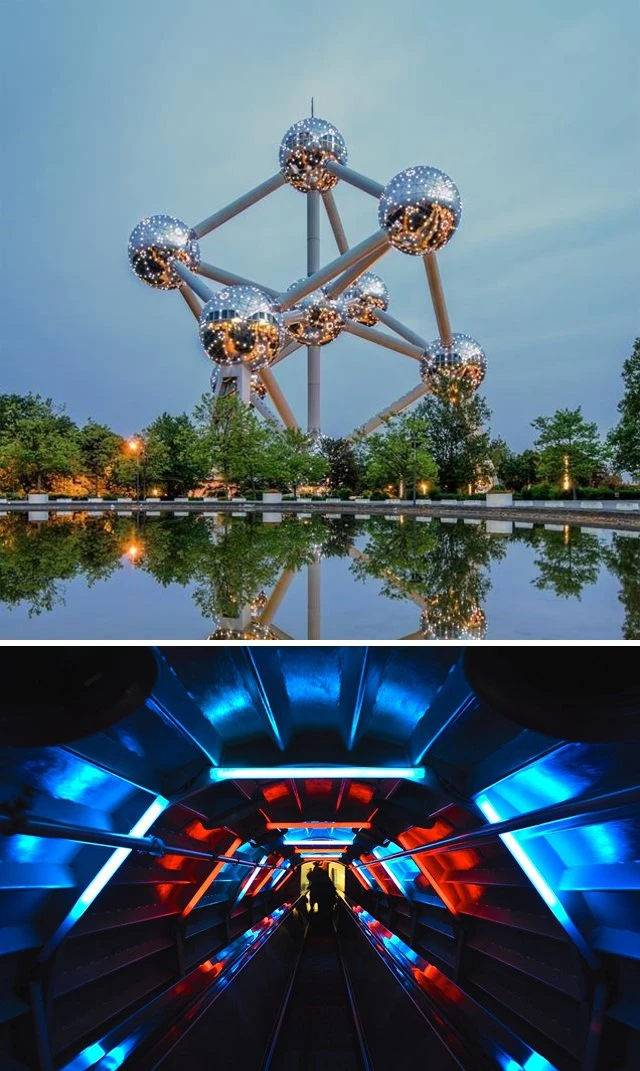 1958년 세계 박람회를 위해 세워진 아토미움은 지름 18m의 9개의 구가 너비 3m의 대각선 튜브로 이어져 있는 구조입니다. 각각의 구 사이는 에스컬레이터가 연결하고 있으며 이 에스컬레이터 중의 하나는 완공 당시 유럽에서 가장 긴 에스컬레이터로 꼽히기도 했습니다.